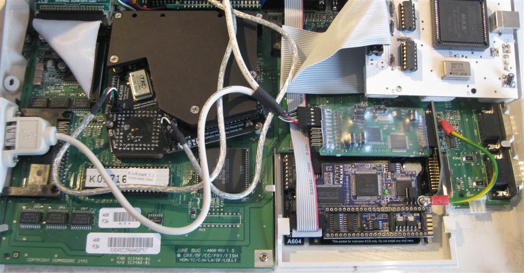 Der Indivision ECS ist ein Flickerfixer und sorgt für die richtige Aufbereitung des Videosignals um eine saubere Darstellung auf allen Monitoren zu gewährleisten. Die Frequenz wird ab 50MHZ aufwärts ausgegeben. Die Indivision ECS wird einfach in den entsprechenden Sockel der A604 gesteckt. Zusätzlich wird ein Massekabel an eine Schraube, die zur Befestigung des Floppylaufwerks dient, gelegt. Das VGA-Kabel wird als Flachbandkabel mitgeliefert. Dieses Kabel habe ich einfach hinten aus dem Gehäuse des Amiga 600 herausgeführt. Die Indivision ECS kann über das Betriebssystem des Amiga geflashed werden und muß nicht extra für ein Update der Firmware ausgebaut werden. Ich habe mit dem Core 1.01 die besten Erfahrungen gemacht. Es empfiehlt sich die kleine Anwendung BBlank in das Verzeichnis C der Hauptpartition zu kopieren und einfach in der startup-sequence mit „C:bblank“ zu laden. Mit diesem Programm wird der Rahmen ausserhalb des Workbenchscreens durchsichtig (schwarz). Somit ist die Darstellung des Randes wieder sauber und nicht etwa zackig. Der Core 1.10 befindet sich im Beta-Status, bietet jedoch die Möglichkeit den Bildschirmtreiber SuperPlus zu verwenden. Die Darstellung in der Auflösung 800×600 wird sauber dargestellt ist jedoch nicht sehr kompatibel mit z.B. WHDLoad-Demos oder -Spielen. Alle zur Zeit erhältlichen Indivision ECS Cores gibt es hier.