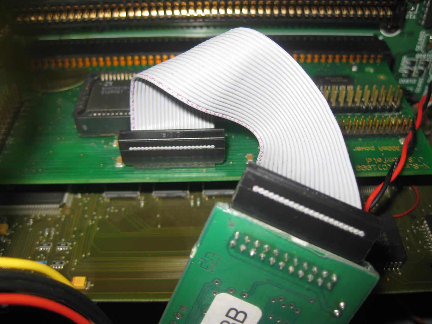 Der Fast ATA Controller bietet einen guten Datendurchsatz von rund 7-8 MB in der Sekunde. Außerdem können an diesem Controller bis zu vier IDE-Geräte betrieben werden. Der Einbau ist im normalem Amiga 1200 kein großes Problem. In meinem Fall liegt der Indivision AGA MK2 jedoch genau unter der Controller-Platine des Fast ATA. Insgesamt habe ich vier weitere Kickstartsockel (jeweils zwei) verwendet um den Fast ATA ein wenig „anzuheben“. Damit sich der Fast ATA garantiert nicht mehr aus seinen Sockeln löst, habe ich ihn vorschriftsmäßig laut Anleitung mit einem Kabelbinder fixiert. Obwohl die Kickstart-Roms nun direkt unter der Tastatur liegen, geht das Gehäuse gerade noch zu. Als kleines Gimmick kann am Fast ATA auch ein Resettaster angeschlossen werden, welchen ich auf die linke Gehäuseseite verlagert habe. Das IDE-Kabel für ein CDROM Laufwerk habe ich einfach nach hinten aus dem Gehäuse heraus geführt.