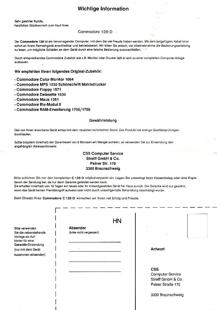Er wurde als ein Nachfolger des C64 konzipiert, der aber auch professionelle Ansprüche befriedigen sollte. Im Januar 1985 wurde das Gerät auf der CES in Las Vegas vorgestellt. Der C128 war der letzte zur Serienreife entwickelte Commodore-8-Bit-Computer. Neben dem nativen C128-Modus verfügt er über zwei zusätzliche Betriebsarten: Den C64-Modus, in dem er nahezu hundertprozentig kompatibel zum C64 ist, sowie den CP/M-Modus, in welchem der Prozessor der 64/128-Modi, der 8502, für Ein- und Ausgabeoperationen zuständig ist und für die CP/M-Kompatibilität ein Z80 von Zilog benutzt wird. Quelle: Wikipedia