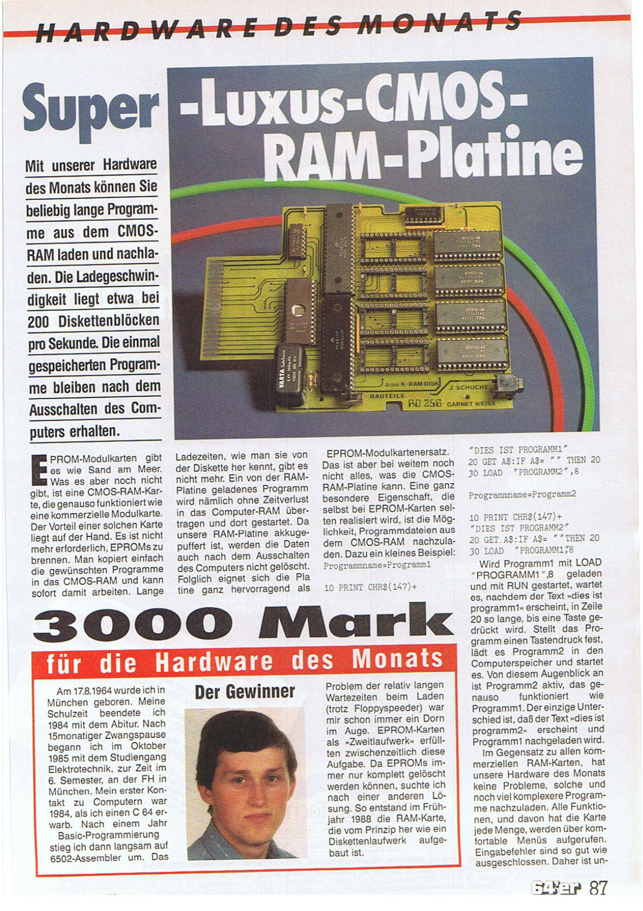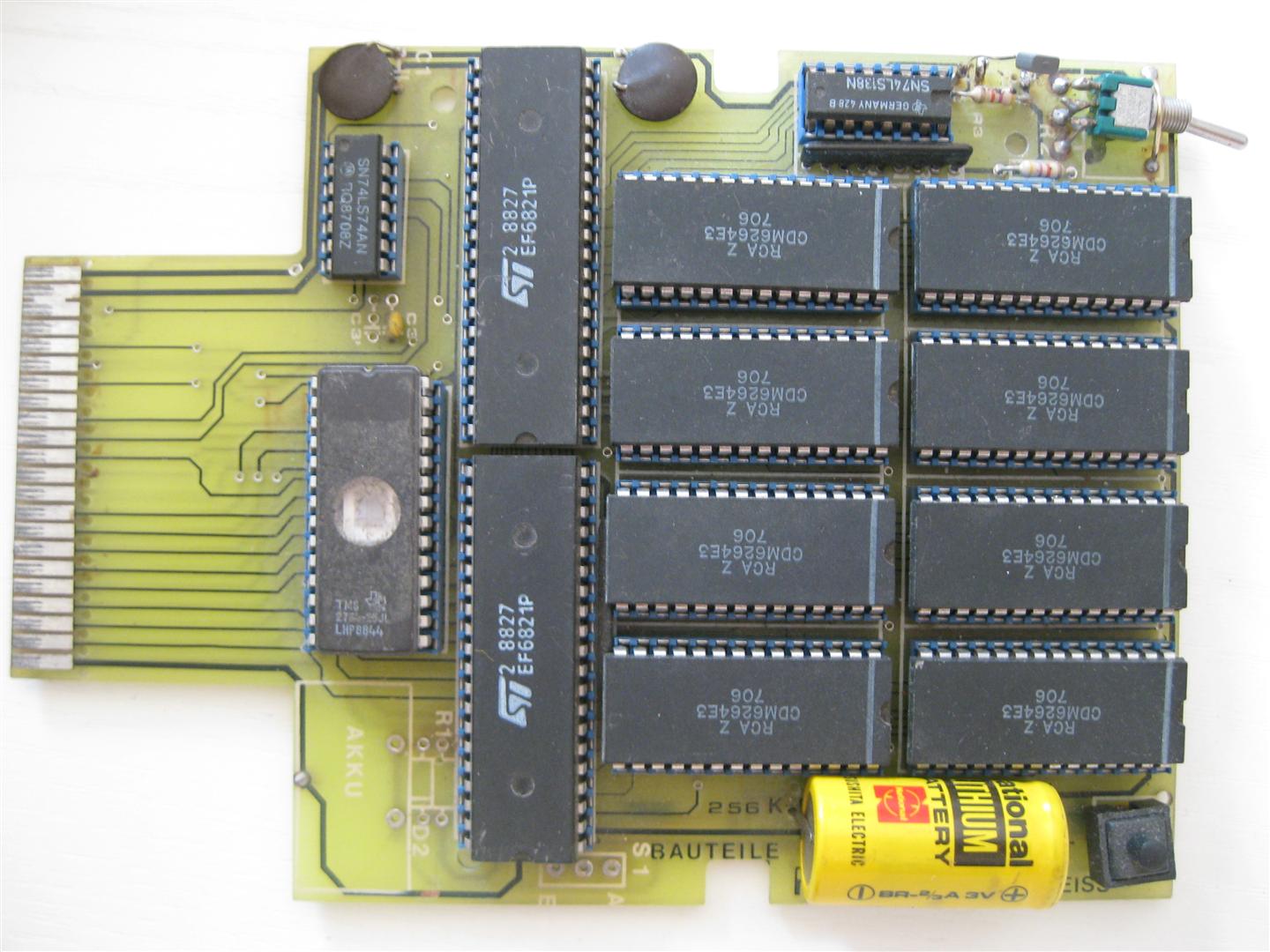Die CMOS RAM Platine wurde 1989 als Hardware des Monats in der Zeitschrift 64’er vorgestellt. Das Modul hat eine Kapazität von 256Kbyte. Auch nach dem Ausschalten des C64/C128 bleiben die gespeicherten Programme erhalten.