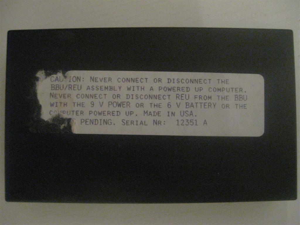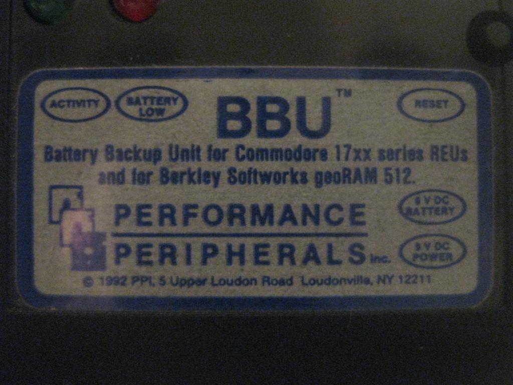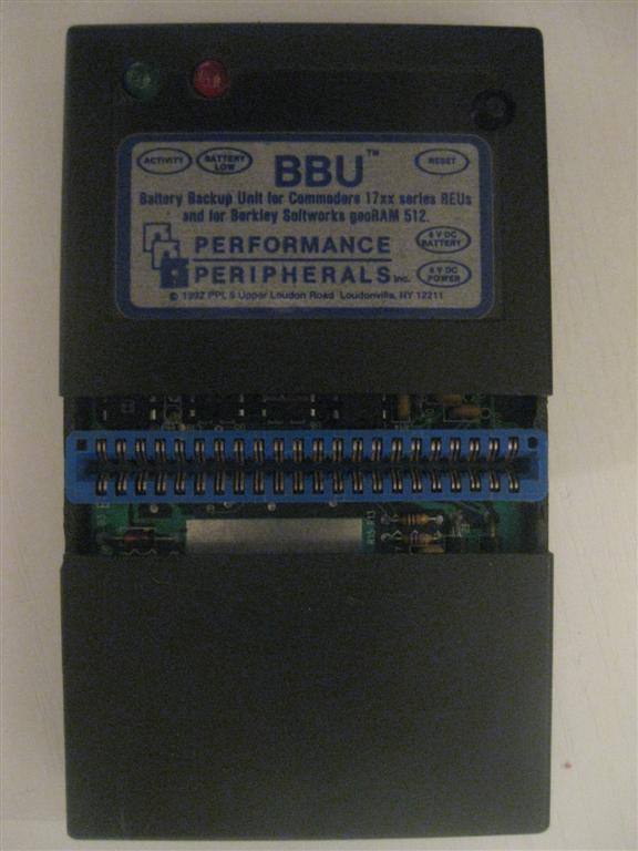 Mit der Battery Backup Unit (BBU) von Performance Peripherals (PPE) bleibt der Speicherinhalt einer REU oder eines GeoRAMs auch bei ausgeschaltetem Commodore 64/128 erhalten. Die Stromversorgung ist über einen mitgelieferten Batteriehalter oder ein Steckernetzgerät mit 9V Gleichspannung gewährleistet.