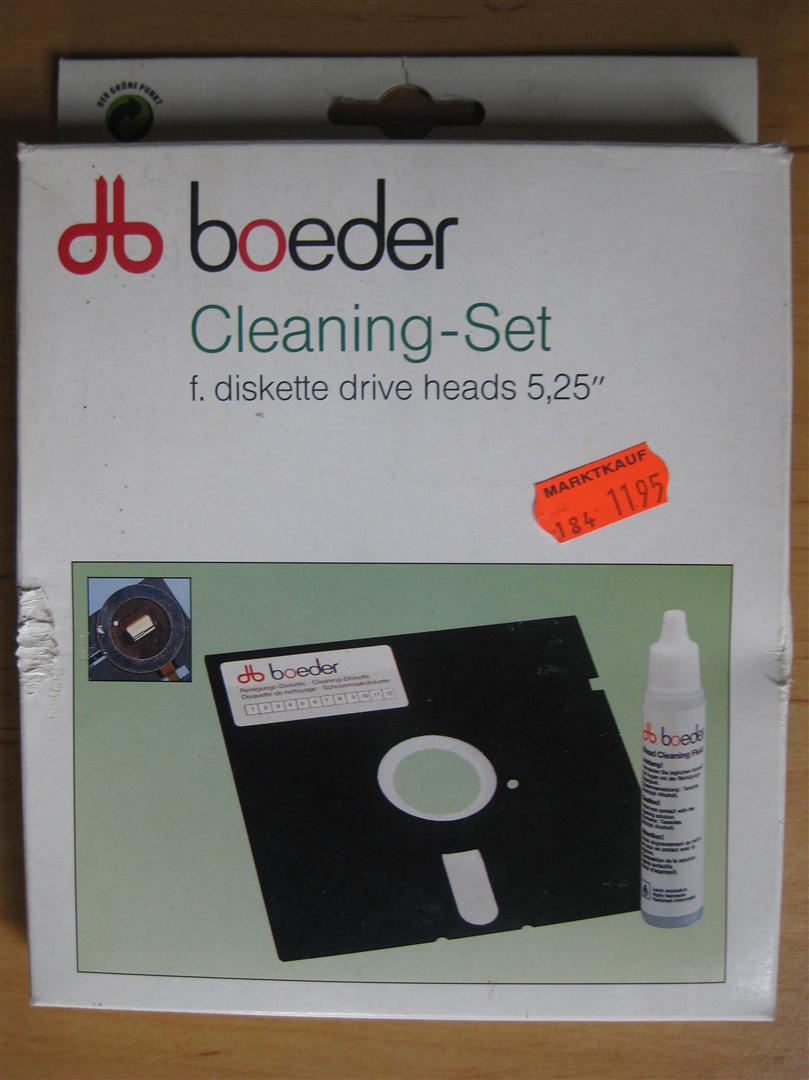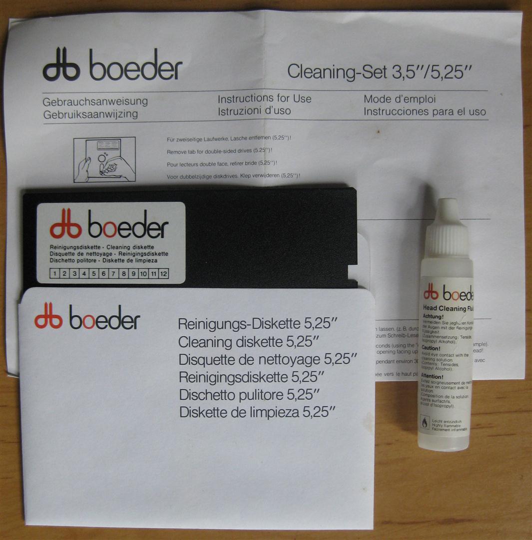 Das Cleaning Set von Boeder beinhaltet eine Reinigungsdiskette und ein Fluid zur Reinigung von 5,25 Zoll Diskettenlaufwerken.