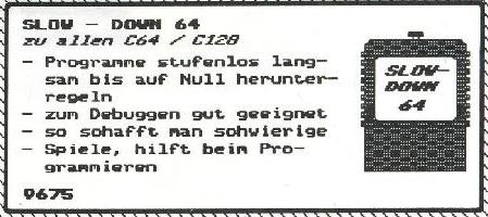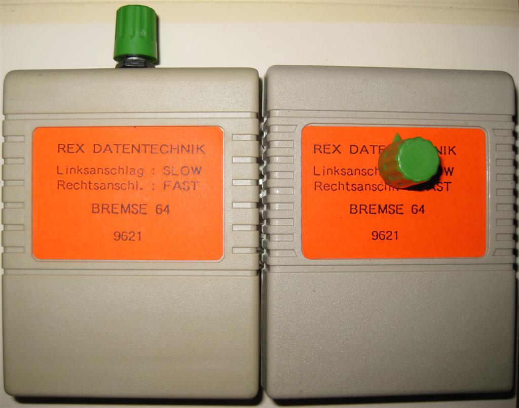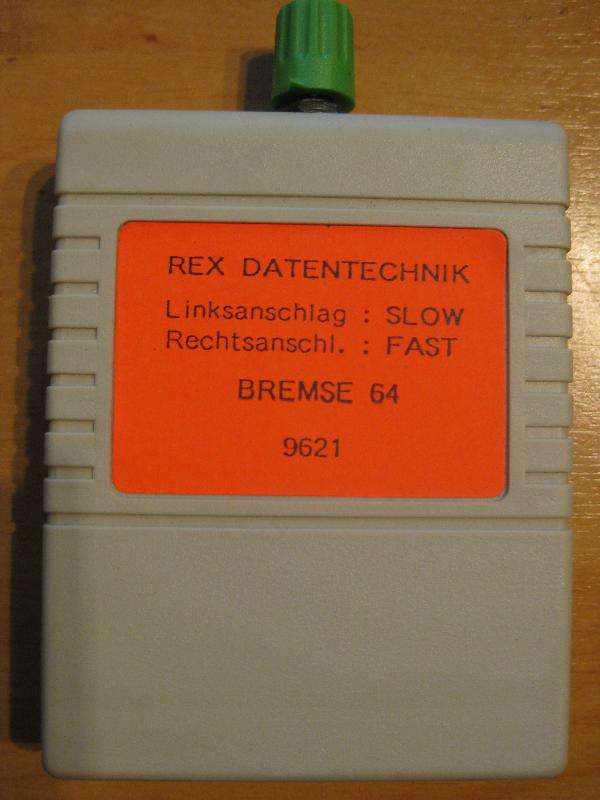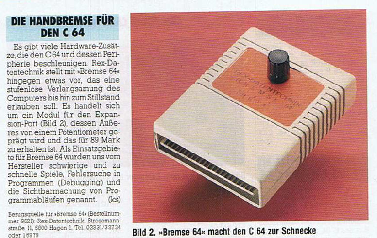 Mit der Bremse64 (Slow-Down Modul) von Rex Datentechnik läßt sich die CPU Geschwindigkeit des C64 bis zum Stillstand stufenlos runter regeln. Durch die Verlangsamung in Spielen können z.B. schwierige Passagen besser gemeistert werden. Das Modul ist baugleich zum REX 9675. Verkaufspreis Rex Datentechnik 39,- DM.