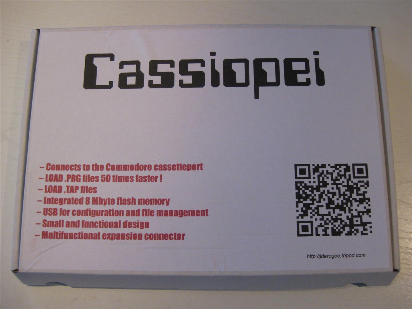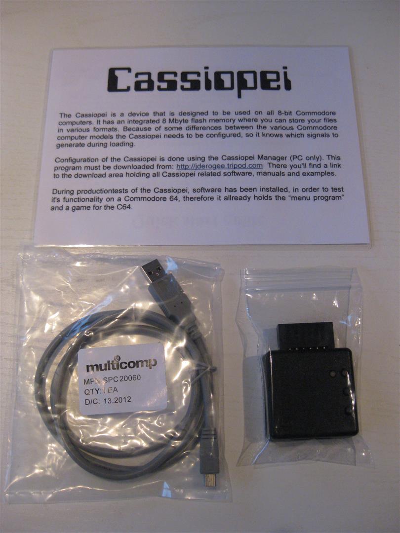 Das Cassiopei ist ein Modul für den Datassettenport eines jeden Commodore Computers und wurde von Jan Derogee entwickelt. Das Modul besitzt einen 8MB Flashspeicher und lässt sich an jedem PC per USB beschreiben. Über einen zusätzlichen Modus lassen sich auch Spiele und Anwendungen per drag/drop vom PC in den Computer laden. Die Ladezeiten lassen sich einstellen. Am Commodore 64 werden Geschwindigkeiten von 50-facher Ladegeschwindigkeit erreicht. Am Cassiopei lassen sich auch externe 12 Volt Geräte anschließen und steuern, wie z.B. Motoren. Das Cassiopei besitzt einen PWM Audio Speech Synthesizer, einen 8KHz, mono, 4/8bit Sample Player sowie einen 10bit Analog zu Digital Converter und einen KlikAanKlikUit Signal Generator. Das Modul unterstützt PRG, TAP und WAV Files.