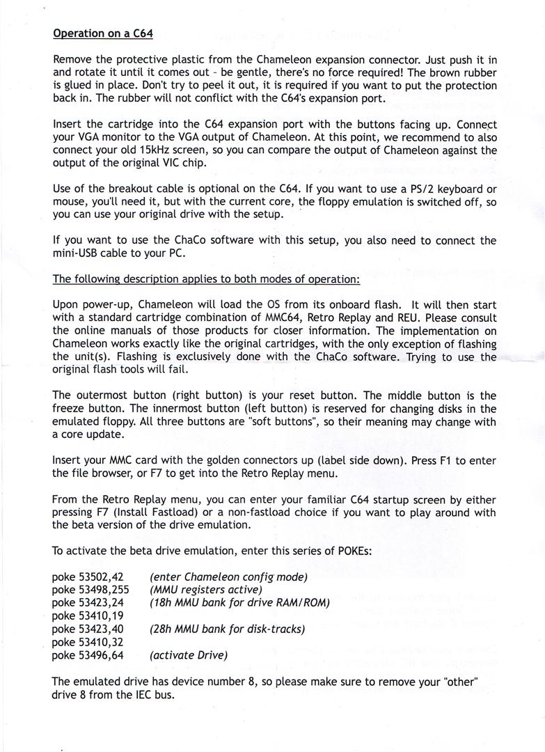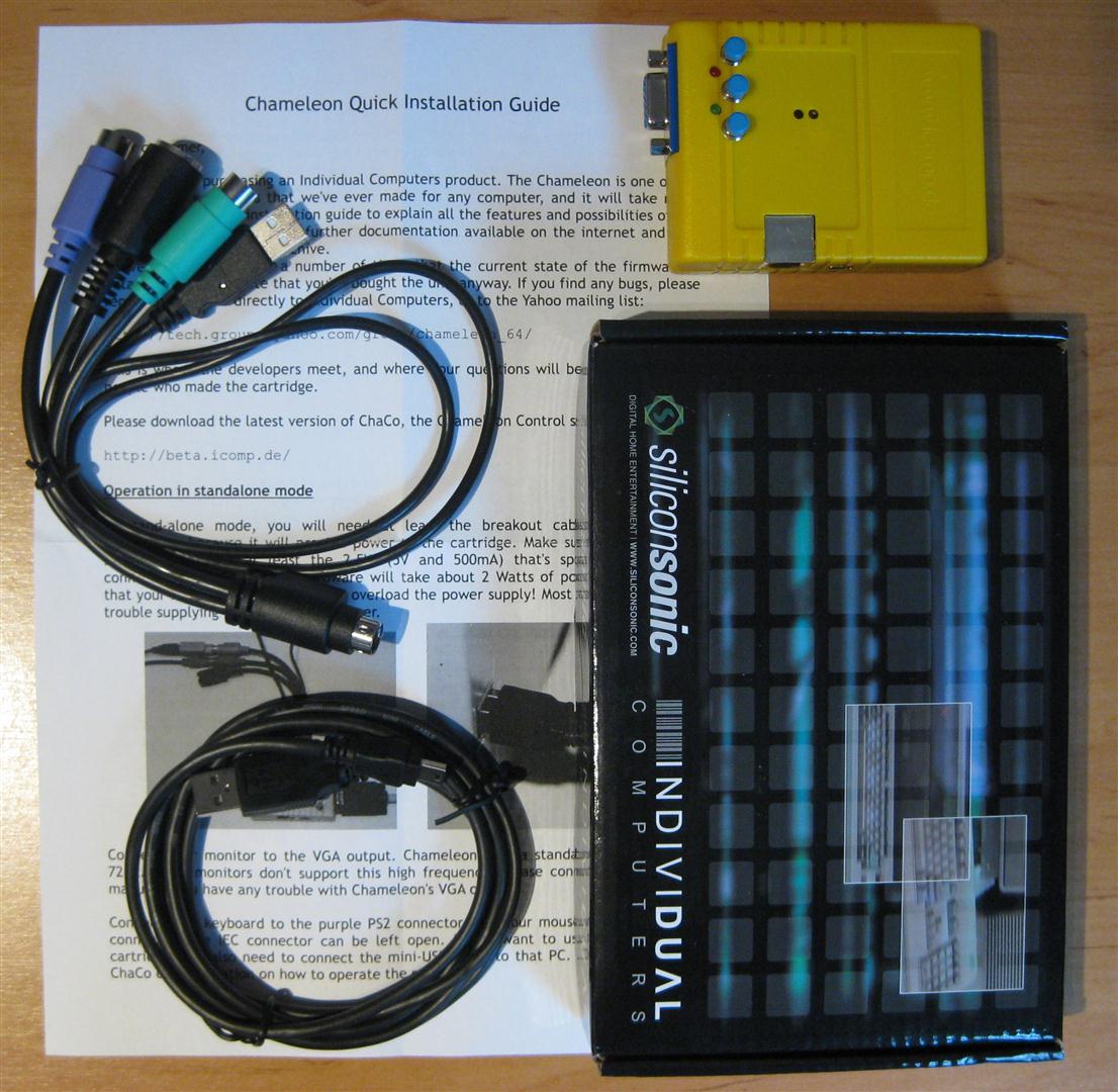 Das Chameleon 64 für den Commodore C64 wurde von Individual Computers hergestellt. Das Modul wurde über mehrere Jahre hinweg entwickelt und bietet bislang ungeahnte Möglichkeiten für den Commodore 64. Das Modul vereint die Funktionen: VGA-Ausgang mit mindestens 60Hz Bildwiederholrate, Zyklusgenaue REU-Emulation mit bis zu 16 MB RAM, MMU erlaubt dem 6510 Zugriff auf die kompletten 32 MB, MMC/SD-Kartenslot mit MMC64- Softwarekompatibilität, Freezer kompatibel mit Retro Replay / MMC Replay, EPROM-/ROM-/Spielmodul-Emulation (crt-Format oder als Binärdateien), Laufwerksemulation (1541-kompatibel), PS/2-Tastaturanschluss inkl. Joystick-Emulation für den Ziffernblock, PS/2-Mausanschluss mit inkl. Emulation einer 1351-Maus (GEOS-kompatibel), Infrarot-Empfänger speziell für CDTV-Fernbedienung, Uhrenport mit Anschlussmöglichkeit für RR-Net, 16 MB benutzerbeschreibbarer Flash-ROM für Firmware-Updates oder zur Speicherung eigener ROMs, 8-Bit-Microcontroller mit EEPROM zur Speicherung von Einstellungen. Weiterhin kann das Chameleon im Standalone Mode ohne C64 betrieben werden.