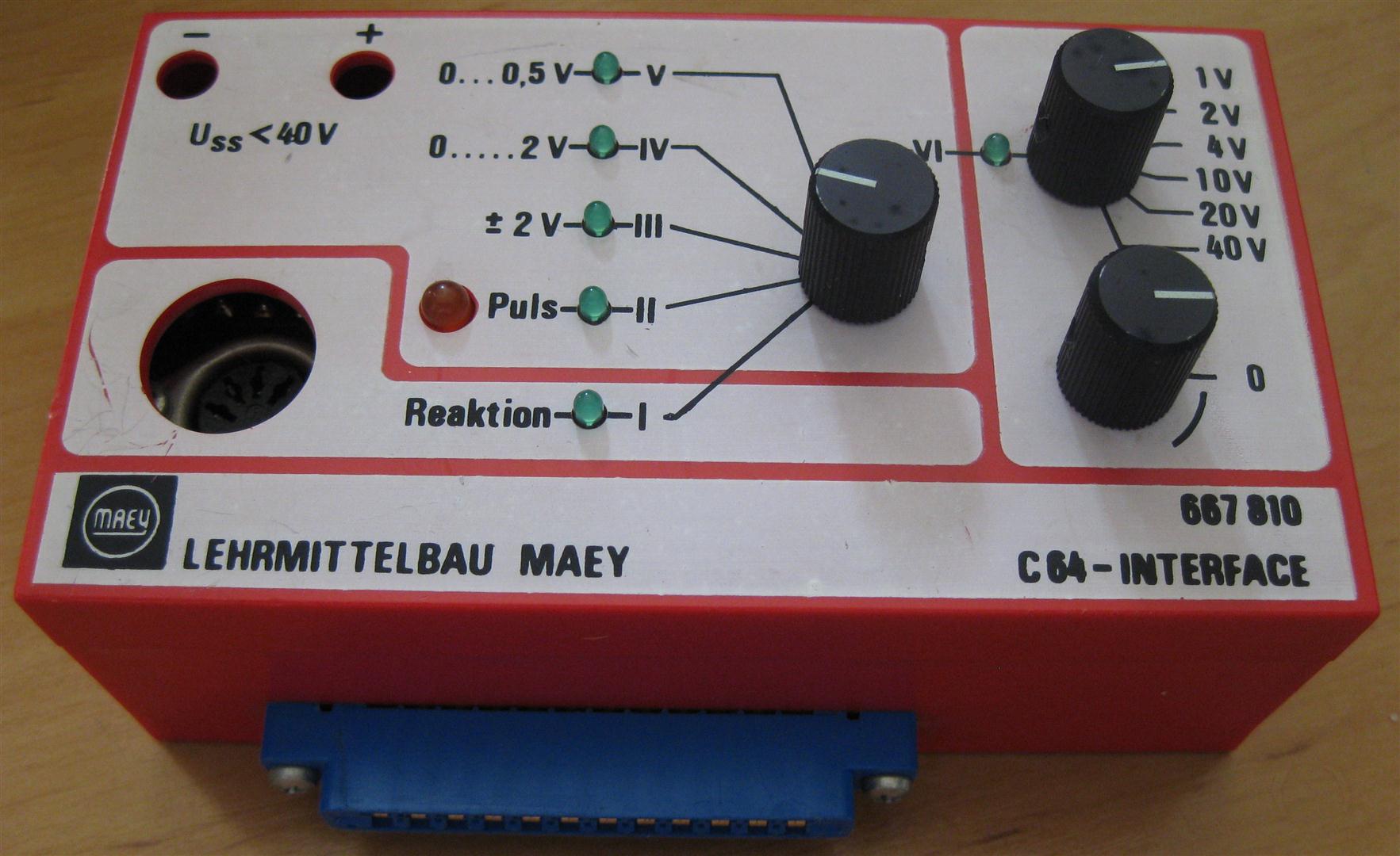 Mit dem C64 Interface 667810 von Maey Lehrmittelbau Bonn lassen sich verschiedene elektronische Aufbauten simulieren. Es wurde hauptsächlich in Schulen eingesetzt.