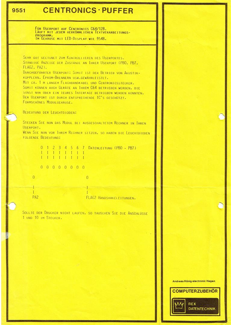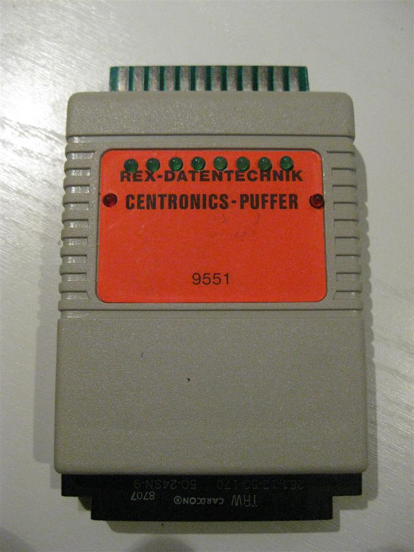 Das Centronics Puffer Modul 9551 von Rex Datentechnik für den C64/C128 überwacht den Userport. Der Userport bleibt frei für andere Erweiterungen.