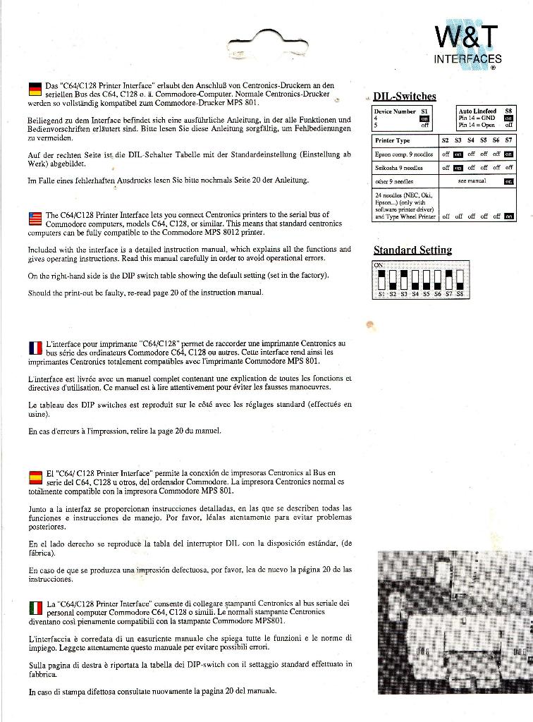 Das C64/C128 Printer Interface erlaubt den Anschluß von Centronics-Druckern an den seriellen Bus. Normale Centronics-Drucker werden so vollständig kompatibel zum Commodore MPS 801.