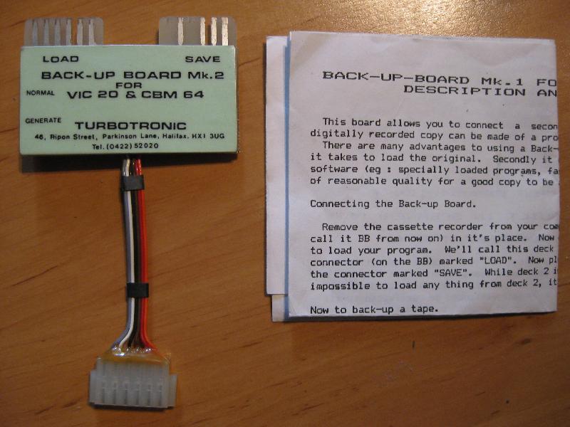 Mit Hilfe des Back-Up-Boards lassen sich Sicherheitskopien von Software- oder Audioquellen erstellen. An das Back-Up Board werden zwei Datassetten angeschlossen. Eine spezielle Software ist nicht notwendig. Der Adapter verfügt über einen winzigen Lautsprecher.