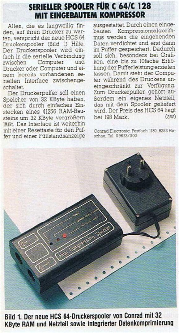 Der HCS-64 ist ein Drucker-Spooler von Auerswald für serielle Drucker am C64/C128. Der Spooler verfügt über einen seriellen Ein- und einen Ausgang sowie einen Resetschalter. Spooling ist ein Vorgang bei welchem zu bearbeitende Druckaufträge in einem Puffer im Speicher oder auf einem externen Datenspeicher gelagert werden, bevor sie der eigentlichen Verarbeitung zugeleitet werden. Die Abarbeitung der im Puffer gehaltenen Aufträge durch das verarbeitende System erfolgt als Stapelverarbeitung.