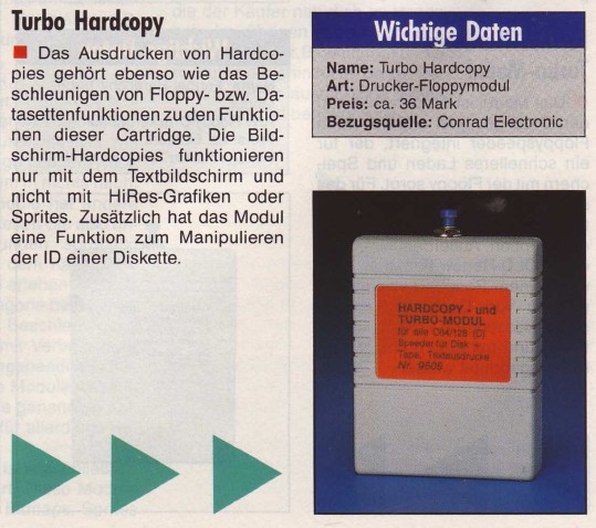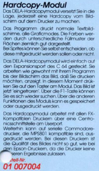 Mit dem Hardcopy 64 Modul für den Commodore C64/128 von Völkner Electronic lassen sich Bildschirmkopien anfertigen, drucken und speichern. Das Modul wurde bei Rex Datentechnik mit der Produktnummer 9712 gefertigt.