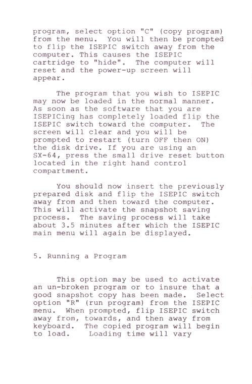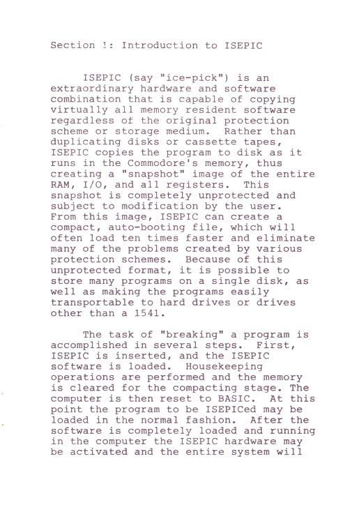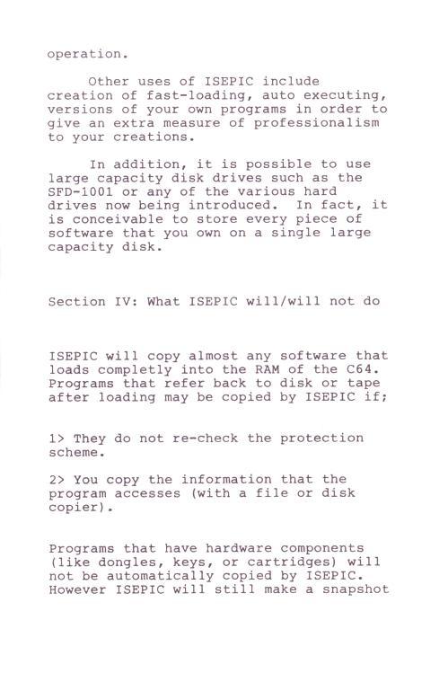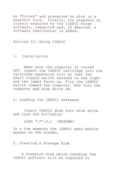 Das Isepic Modul von Chip Gracey und Starpoint Software ist ein leistungsstarker Freezer für den C64/C128. Im Gegensatz zu anderen Modulen ist es möglich selbst von Kopiergeschützter Software Sicherungskopien zu erstellen. Über einen Schalter läßt sich das Modul deaktivieren. Das Modulmenü muß per Diskette geladen werden.