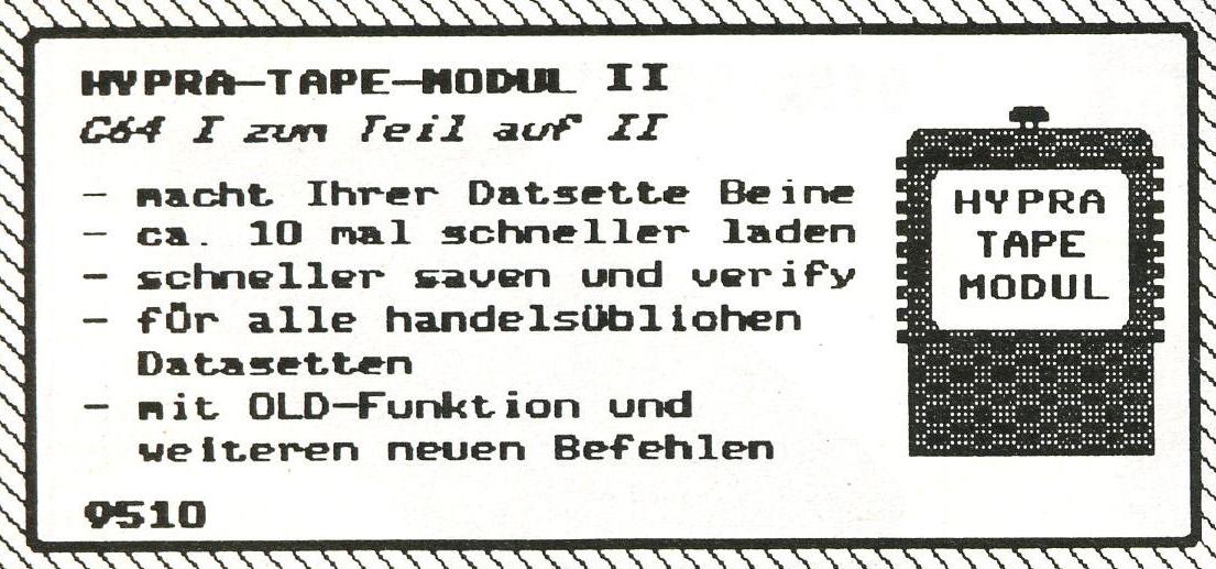 Das Hypra-Tape-Modul 9510 von Rex Datentechnik beinhaltet das Tape-Speeder System Speed-Tape. Speed-Tape beschleunigt die Ladefunktion der Datassette um das ca. 10-fache. Katalogpreis 29,95 DM.