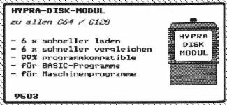 Das Hypra Disk Modul 9503 von Rex Datentechnik für den Commodore C64/C128 beschleunigt die Floppy 1541 um den Faktor 6 und ist zu 99% kompatibel.