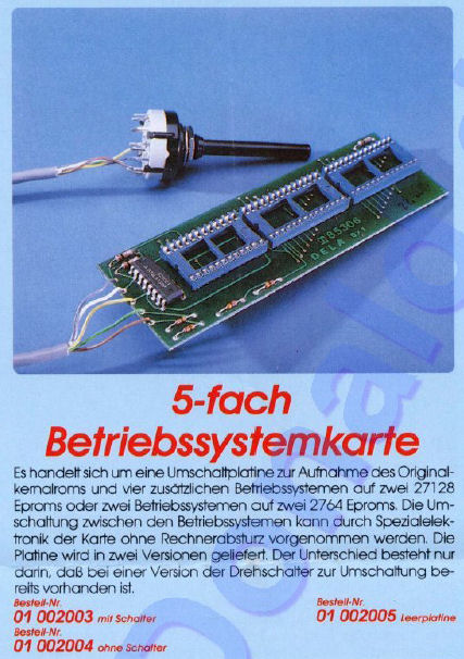 Die Kernalumschaltplatine 85306 von Dela (5-fach Betriebssystemkarte) bietet Platz für das original Betriebssystem und vier weiteren auf 27128 Eproms oder zwei auf 2764 Eproms. Die Umschaltung erfolgt ohne Absturz des Rechners über einen Drehschalter.