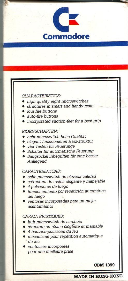 Der Commodore Joystick 1399 verfügt über 8 Microschalter, 4 Feuerknöpfe und Dauerfeuerfunktion. Interessant sind die Schreib- und Übersetzungsfehler auf der Verpackung.
