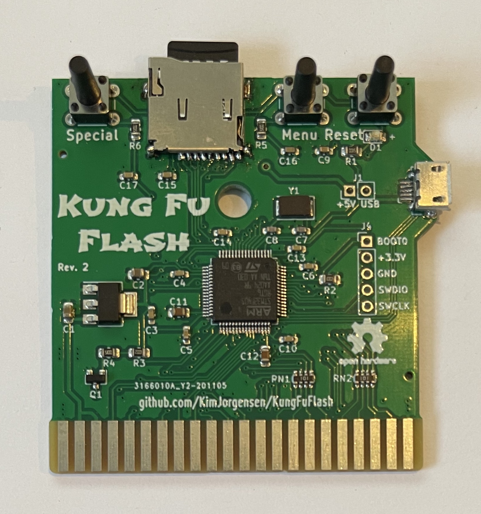 Das Kung Fu Flash Modul für den Commodore 64 ist in der Lage viele andere Steckmodule zu emulieren. Es verfügt über einen SD-Karten Steckplatz und ist kompatibel mit PRG/P00/D64/D71/D81 und CRT-Dateien. Über einen USB-Port können Dateien von einem PC übertragen werden.