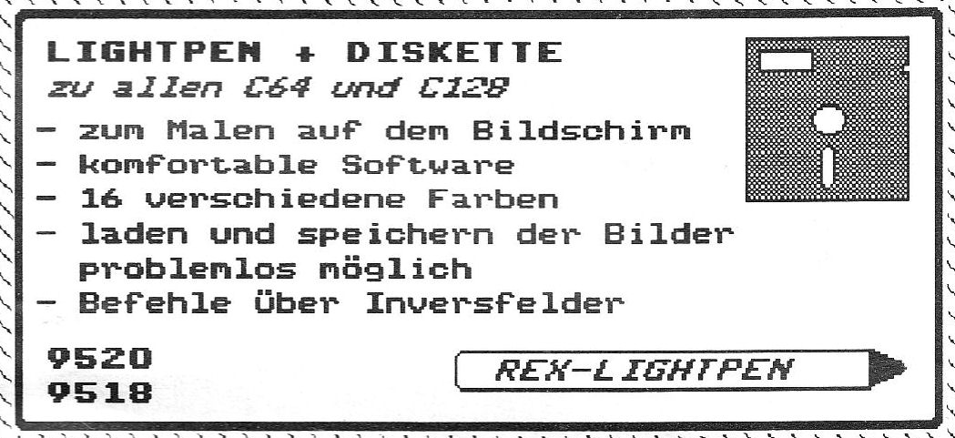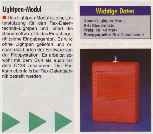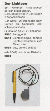 Das Lightpen Modul 9541 von Rex-Datentechnik bietet die Software für alle am C64/C128 Joystickport betriebenen Lightpen. Die Funktionen Zeichnen, Lightpen justieren, Farbe einstellen, Bild laden und spechern stehen zur Verfügung. Zusätzlich besitzt das Modul einen Resettaster. Katalogpreis Rex Datentechnik 39,- DM.