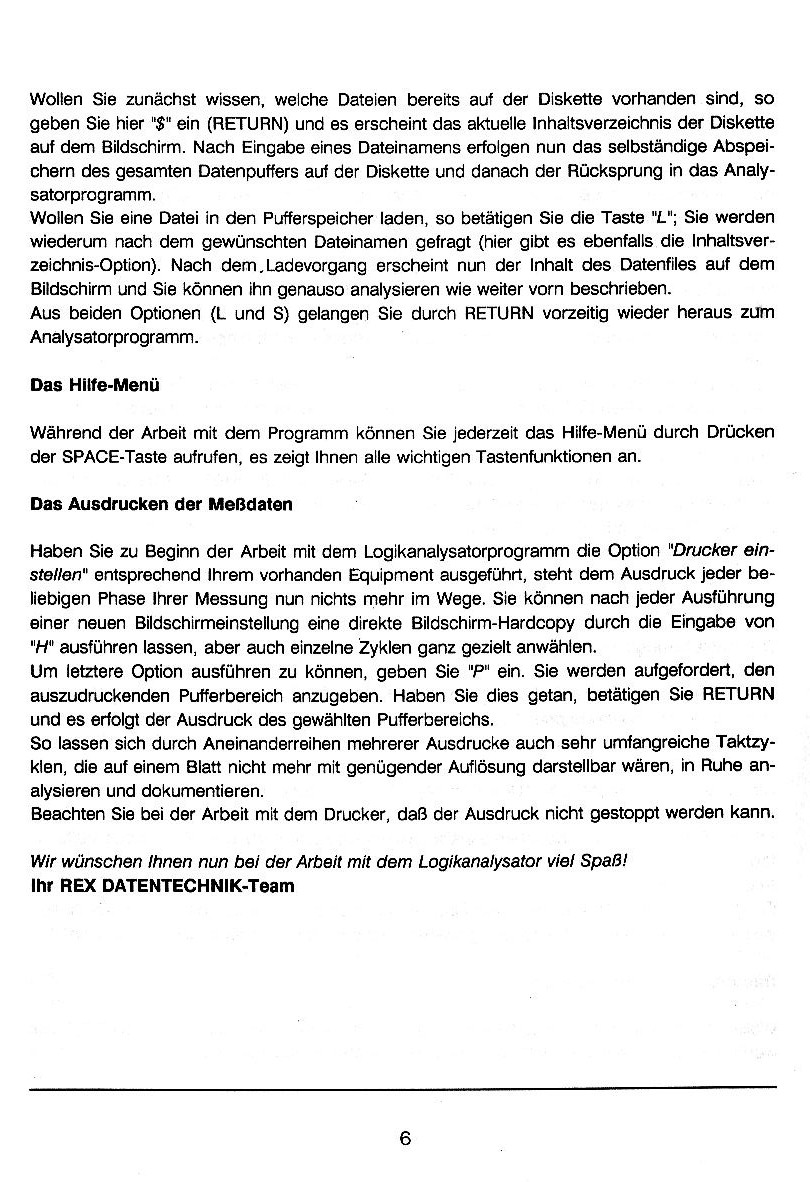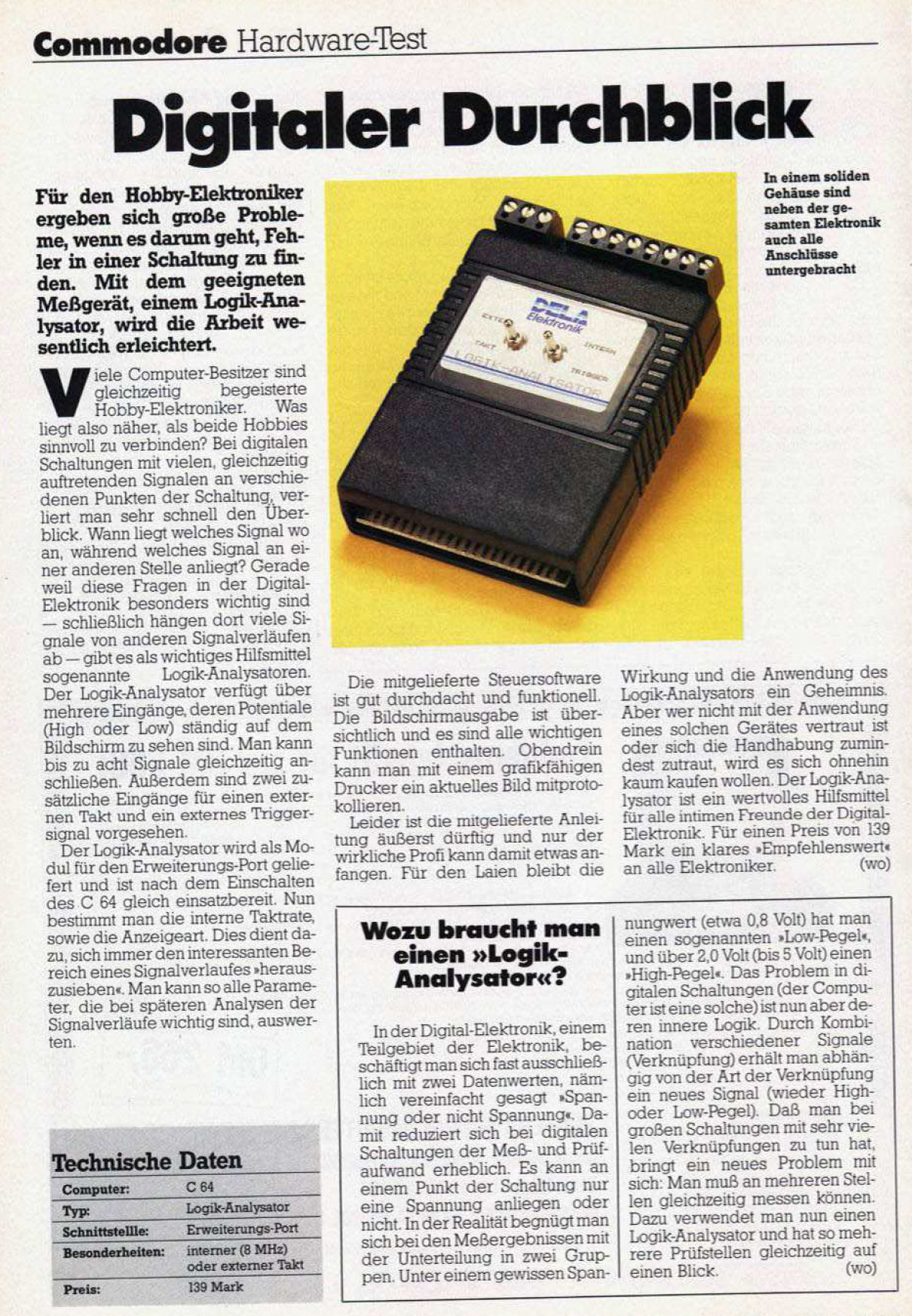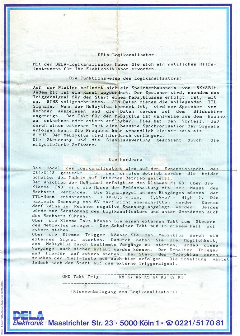 Der Logicanalisator von Dela besitzt 8 Datenkanäle, welche mit 8 MHz getaktet sind. Der Analisator bietet eine Auflösung von 8192 Taktzyklen. Die Meßwerte können auf Diskette gespeichert werden. Der Rex Logik-Analysator 9664 ist baugleich.