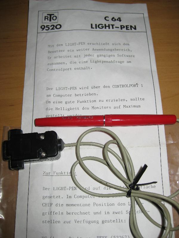 Der Lightpen (zu deutsch: Lichtgriffel oder Lichtstift) ist ein optisches Eingabegerät, dass einem Kugelschreiber ähnlich sieht. Es wird am C64 über den Controlport 1 angeschlossen. Hält man ihn auf den Bildschirm oder Monitor, erkennt ein entsprechendes Programm die Position des Stifts und kann sie in Bildschirmkoordinaten umrechnen. (Simons‘ Basic enthält Befehle für diesen Zweck.) Die Arbeit mit dem Lightpen war insbesondere bei Grafik- und Zeichenprogrammen nützlich, jedoch konnte sich der Lightpen nie gegenüber dem Joystick oder der Maus durchsetzen. Der Lightpen für Commodore-Computer wurde ab dem Jahr 1983 gebaut. GEOS enthält auch einen Treiber für den Lightpen, so dass dieser in den Grafikprogrammen GeoPaint und GeoCanvas eingesetzt werden kann. Quelle: Wikipedia