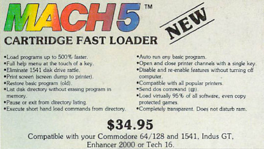 Das Mach5 Steckmodul von Access Software kam 1985 auf den Markt und verringert die Ladezeit der 1541 Floppy deutlich. Als zusätzliches Feature besitzt das Modul 4 Kb RAM für Basic Programme.