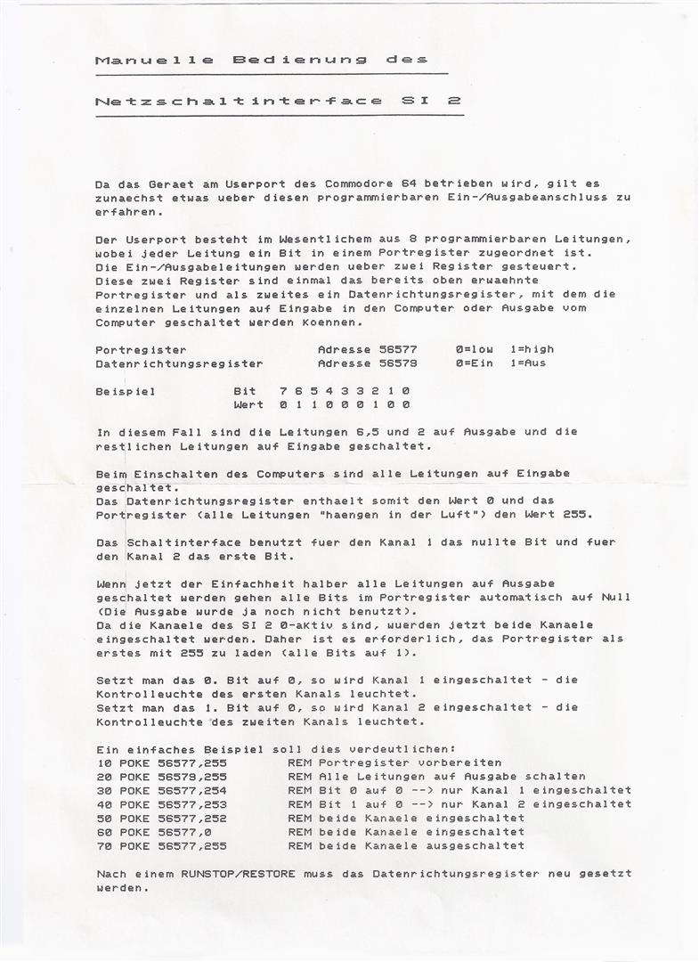 Das 2 Kanal Netz-Schaltinterface SI2 (2 channel power supply unit and switch) von Qualimex für den Commodore 64 hat die Bestell-Nummer 111016 und kann zwei Verbraucher bis 1000 Watt ansteuern. Das Interface lässt sich automatisch per Software oder per Befehl manuell steuern.