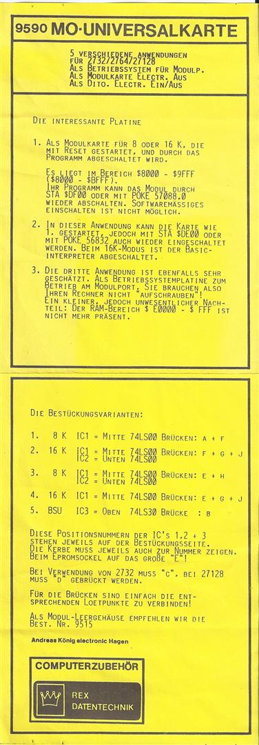 Mit dem Micro Maxi Prommer 9555 von REX-Datentechnik lassen sich die Eprom-Typen der 27er Reihe (2716-27256) programmieren. Rex Katalogpreis 149,- DM.