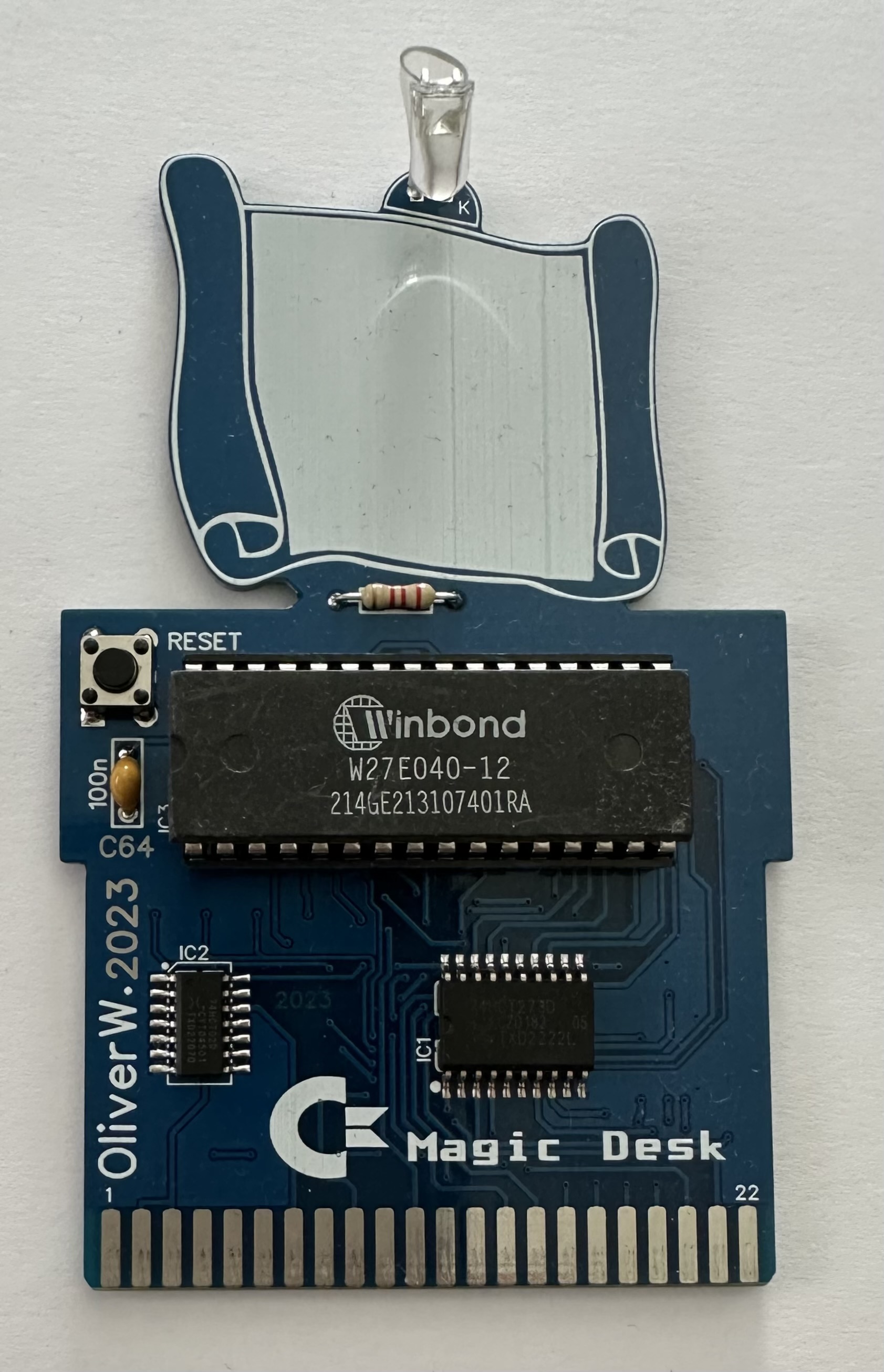 Bei dem Magic Desk Modul von Oliver W. sind wie bei der Original Karte von Marko Šolajić 27C512, 27C010/020/040 und 29F010/020/040 möglich. Das Modul bietet eine Papyrusrolle zur Beschriftung inkl. Beleuchtung und einen Reset-Taster. Auf der Rückseite finden sich die Jumper-Stellungen.
