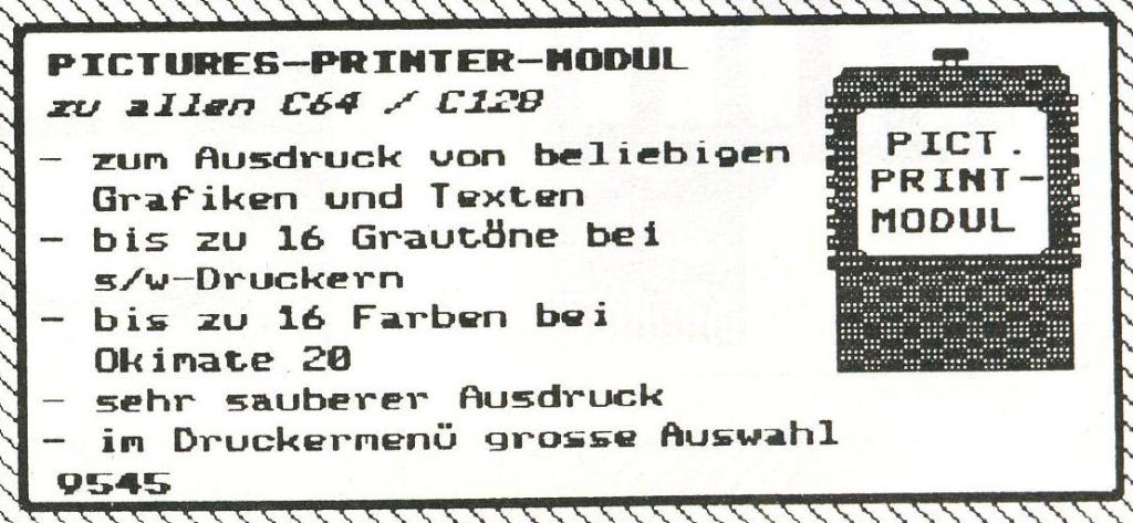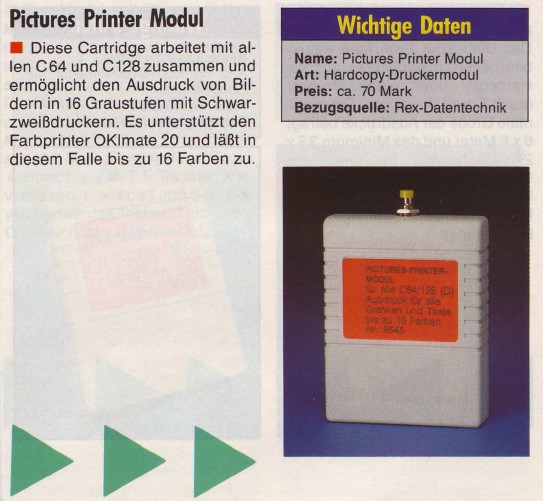 Das Pictures Printer Modul 9545 von Rex Datentechnik dient zum Ausdruck beliebiger Grafiken und Texten in 16 Grautönen oder Farben. Diese Funktion wird einfach per Tastendruck aktiviert. Das Modul läßt sich über einen Schalter deaktivieren. Katalogpreis Rex Datentechnik 99,- DM.