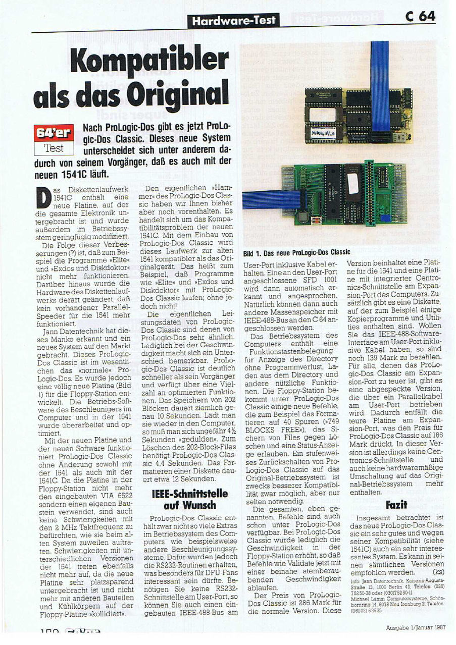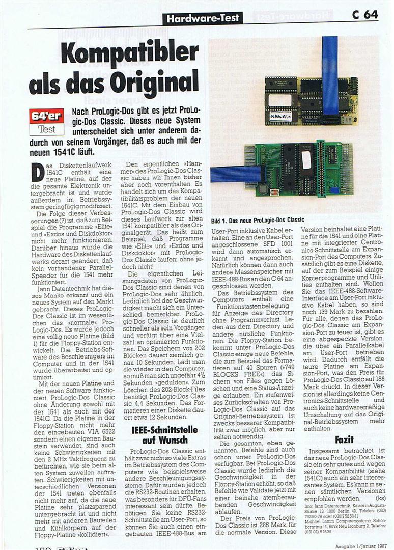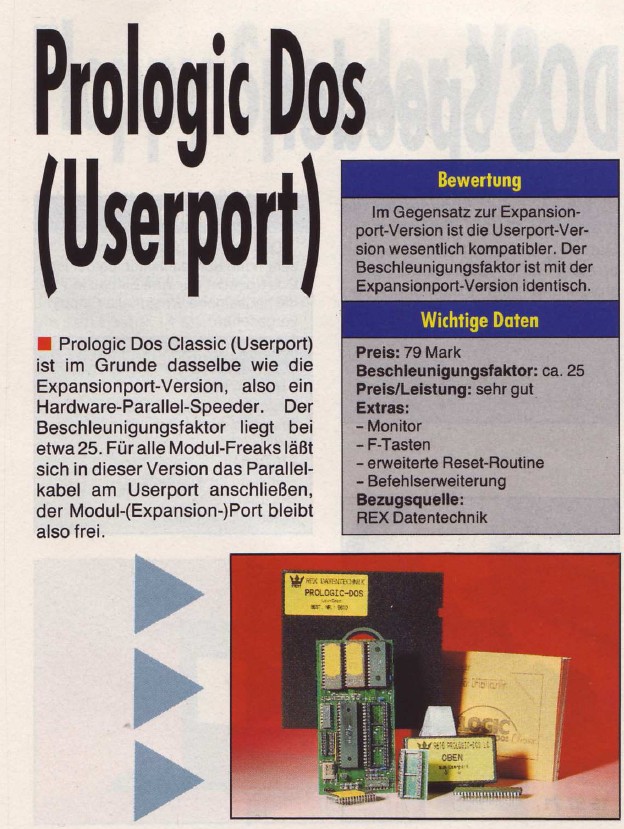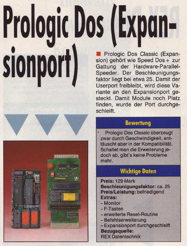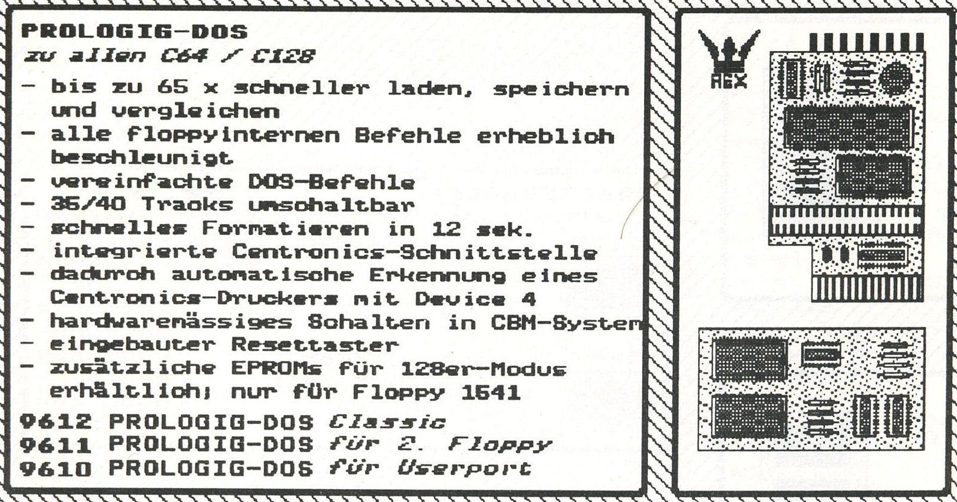 Prologic DOS Classic von Rex Datentechnik ist ein Schnell-Lader der zum einen ein Modul auf dem Diskettenlaufwerk 1541, zum anderen ein Modul über den Userport des C64 beinhaltet. Das Ganze wird verbunden über ein Parallelkabel und sorgte dafür, dass eine Beschleunigung von sage und schreibe dem 200-fachen der Normalgeschwindigkeit erreicht wird. Katalogpreis Rex 289,- DM.