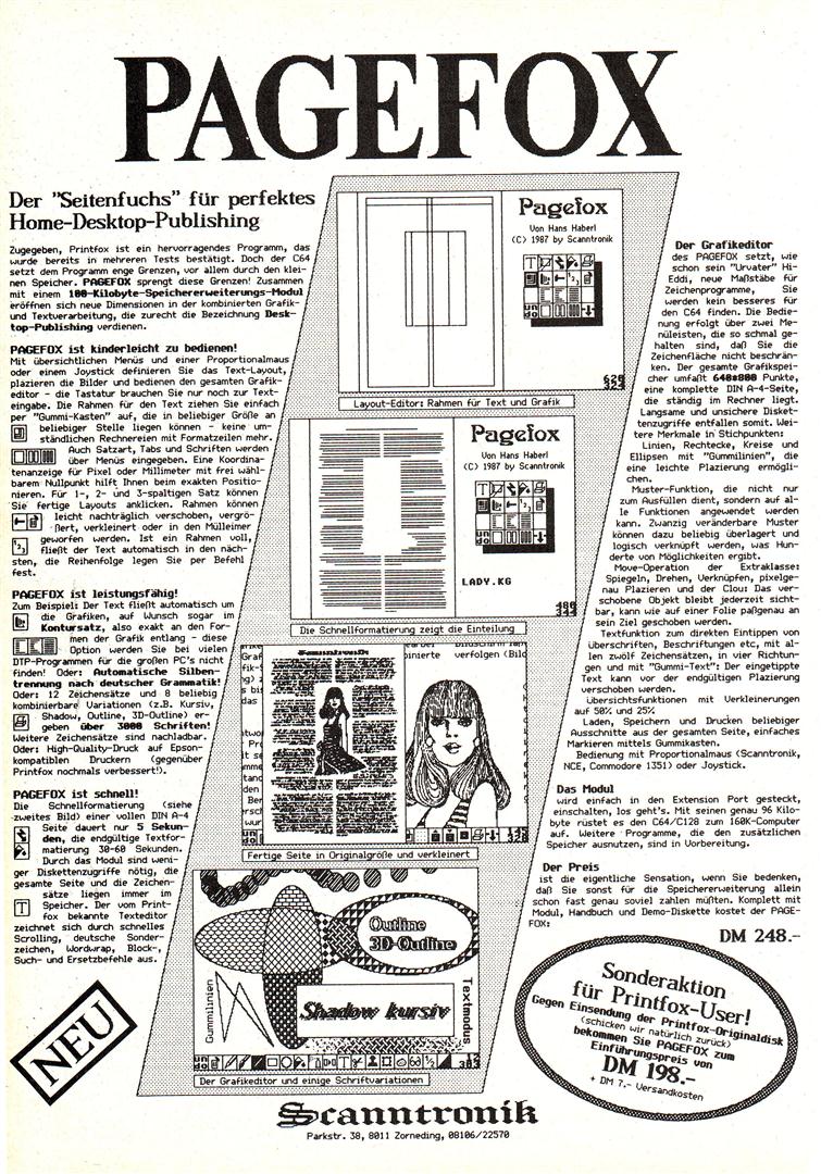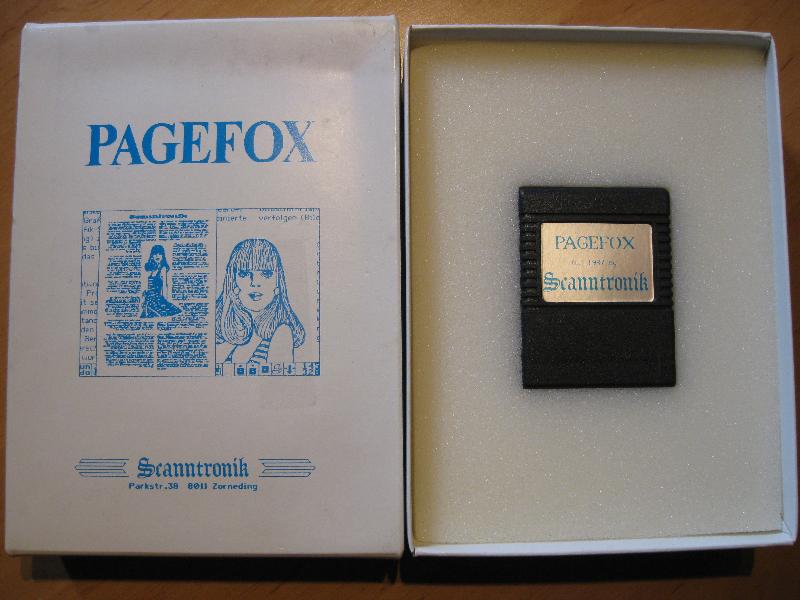 Desktop Publishing schien wegen des hohen Speicherbedarfs auf dem C64 kaum realisierbar. Pagefox löst das Problem durch ein 100Kbyte Speichererweiterungsmodul, das einfach in den Expansionsport des C64 oder C128 gesteckt wird. Pagefox vereint drei Programme in sich : Einen Texteditor, einen Grafikeditor und den Layout-Editor. Ausdruck höchster Qualität auf Epson-kompatiblen Druckern. Auch Commodore Drucker werden unterstützt. VK-Preis : 248,- DM