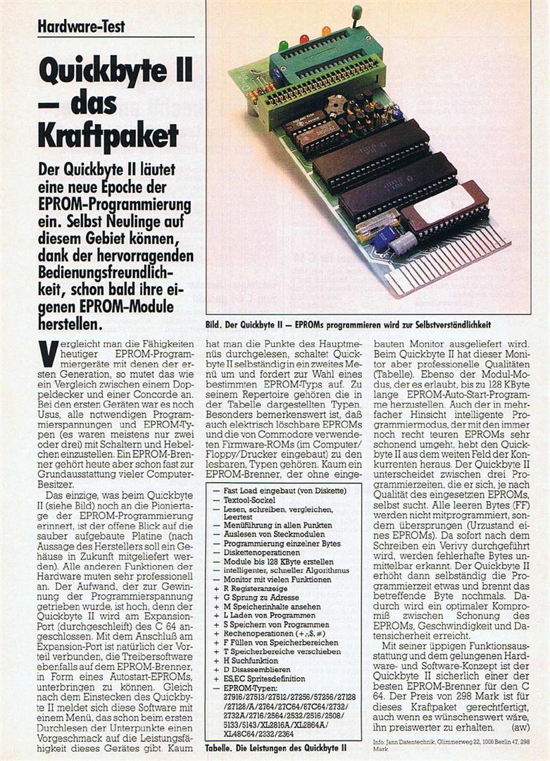 Der Quickbyte 2 Eprommer von Jann Datentechnik brennt alle 25xx, 2716-27512, kompatible CMOS-Typen sowie EEPROMS (x12016a/x12864). Die Software des Quickbyte II meldet sich direkt nach dem Einschalten.