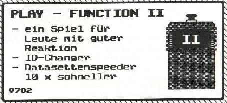 Das Play Function 2 Modul von Rex Datentechnik enthält einen Disk-ID Changer, Hypra-Tape und das Spiel Software-Pirates. Weiterhin ist ein ID-Changer und ein Datassettenspeeder (18x) enthalten.