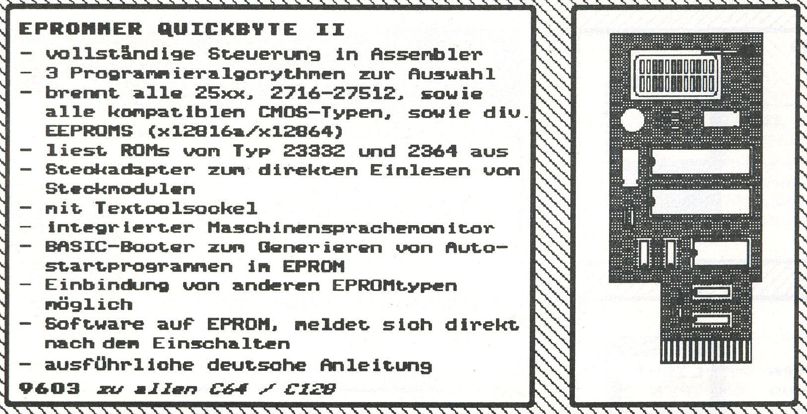Der Quickbyte Eprommer 2 9603 von Rex Datentechnik brennt alle 25xx, 2716-27512, kompatible CMOS-Typen sowie EEPROMS (x12016a/x12864). Die Software des Quickbyte II meldet sich direkt nach dem Einschalten. Katalogpreis Rex 198,- DM.