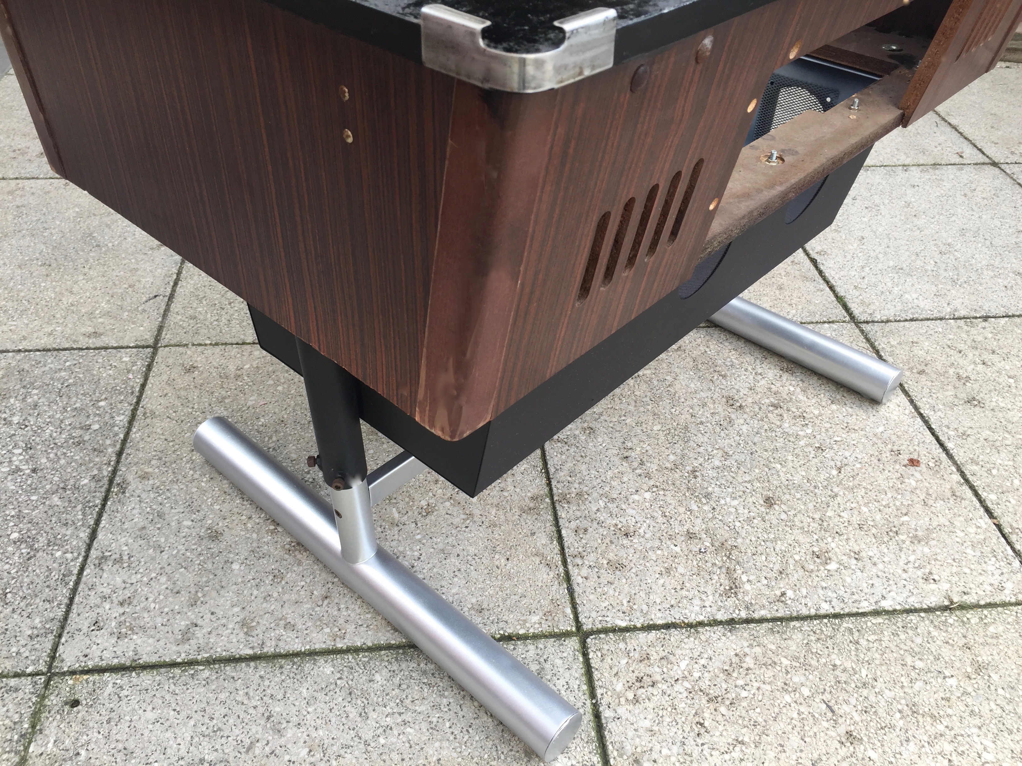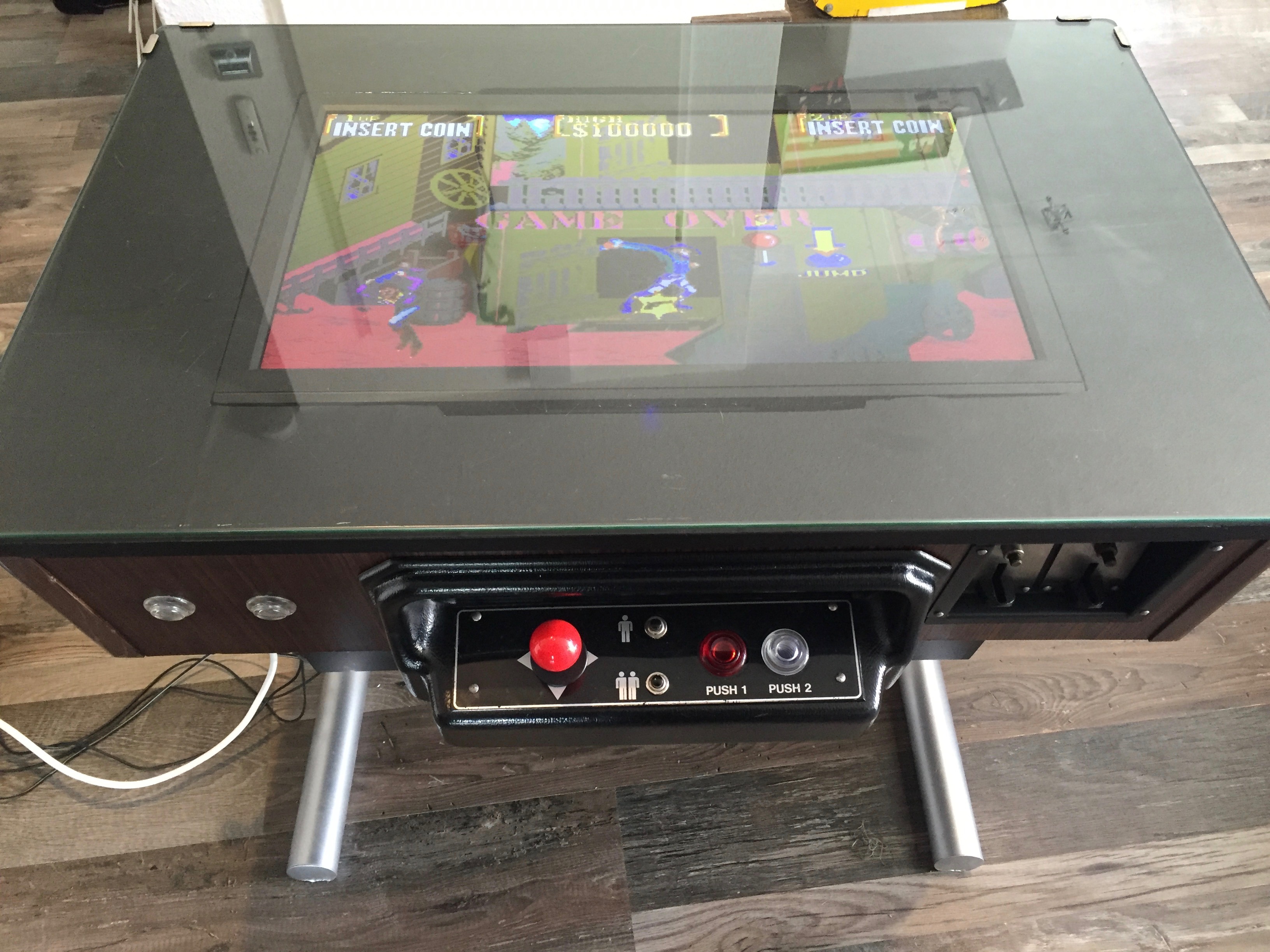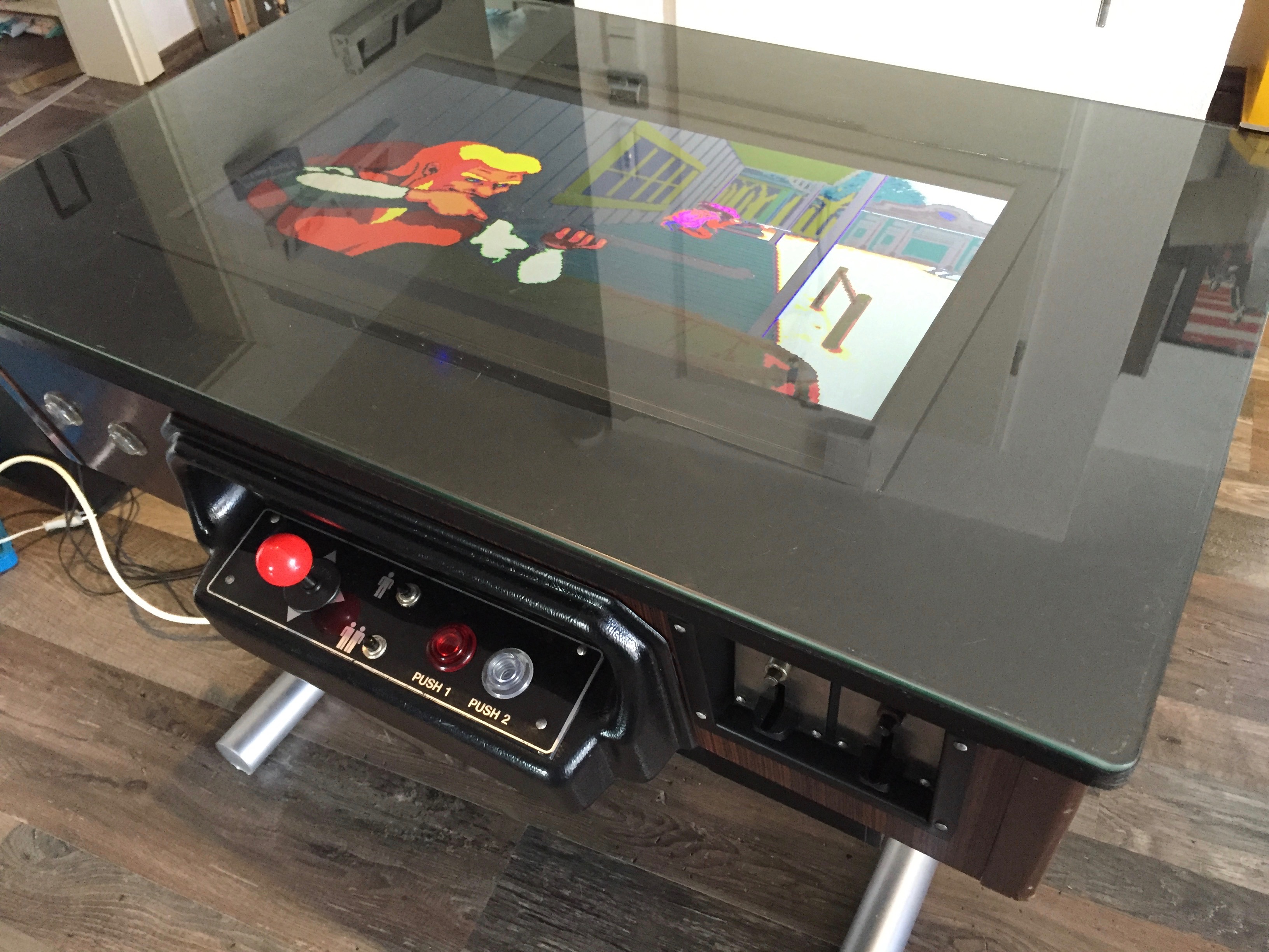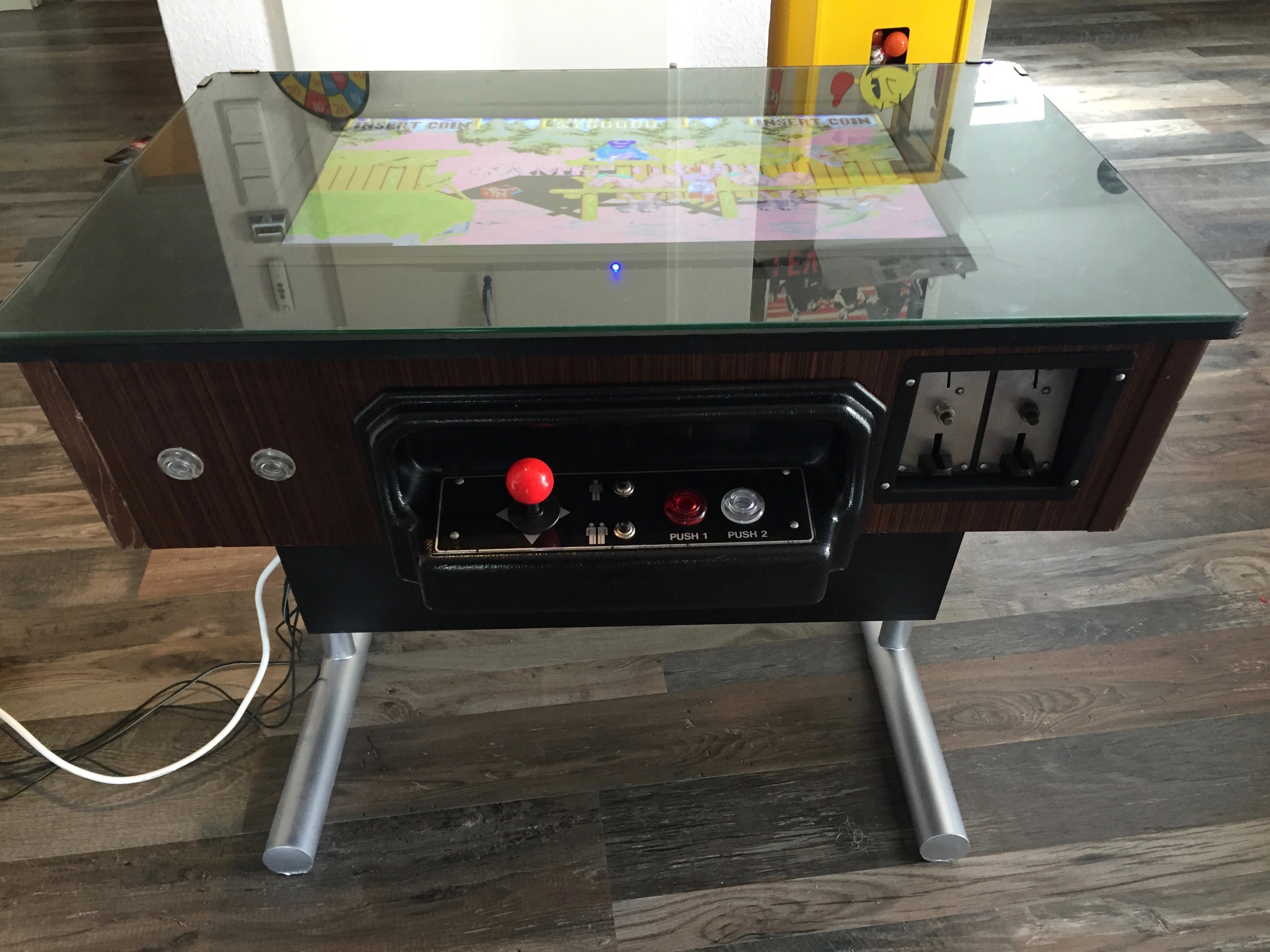 Es war eher ein Zufall, als ich mir vor einiger Zeit einen Arcade Table gekauft habe. Auf dem Gerät war das Spiel Donkey Kong. Leider war der Monitor defekt und das Gerät insgesamt in einem schlechten Zustand. Bei der Restauration war mir wichtig, dass der 80er Jahre Nussbaum-Look erhalten bleibt. Die Münzprüfer mussten unbedingt erhalten bleiben und sollten auch weiterhin DM annehmen. Die Joysticks und Knöpfe musste ich erneuern. Auch den Röhrenmonitor habe ich durch einen 24″ Monitor ersetzt. Im inneren werkelt nun der Arcade Emulator M.A.M.E.