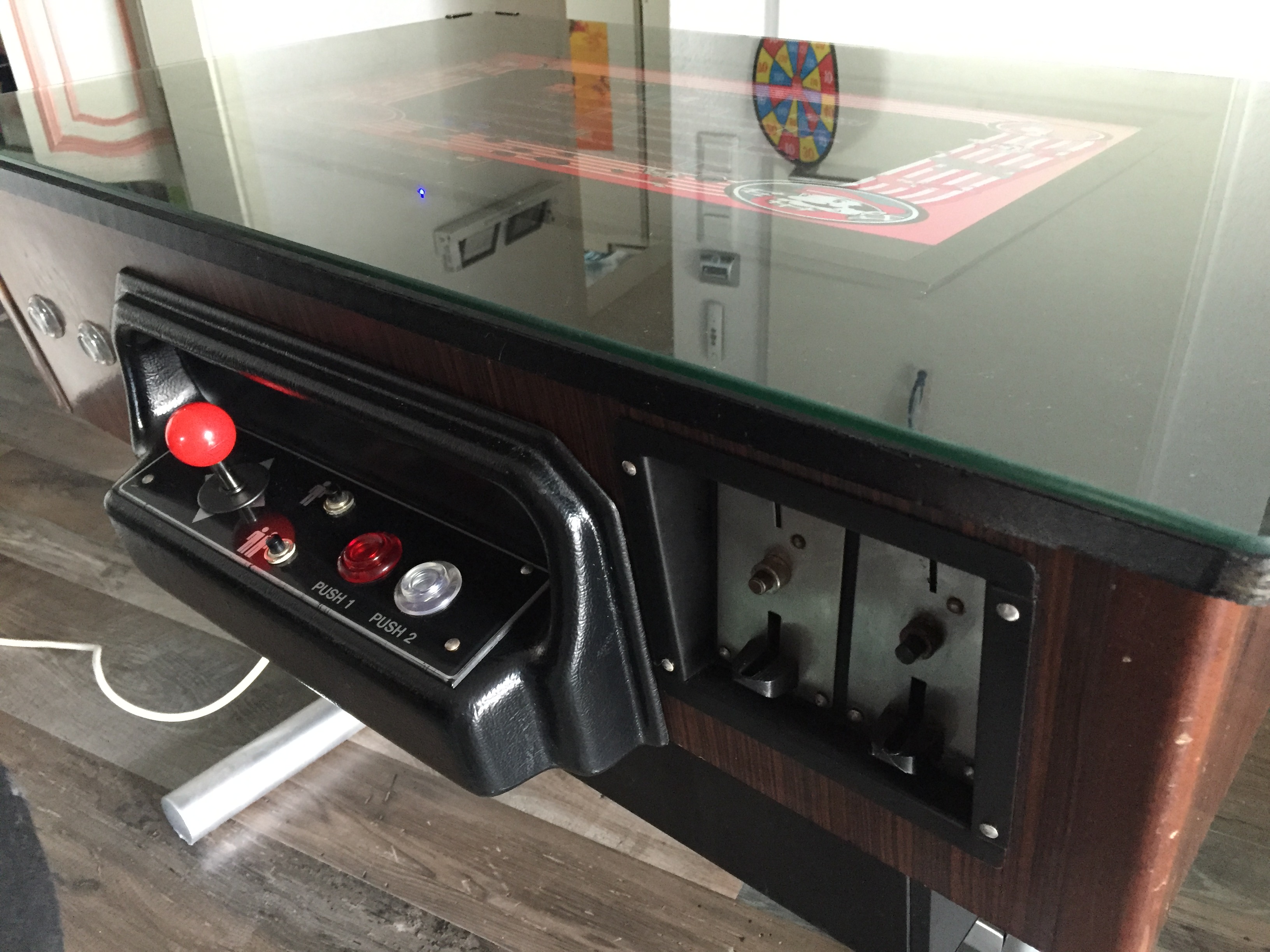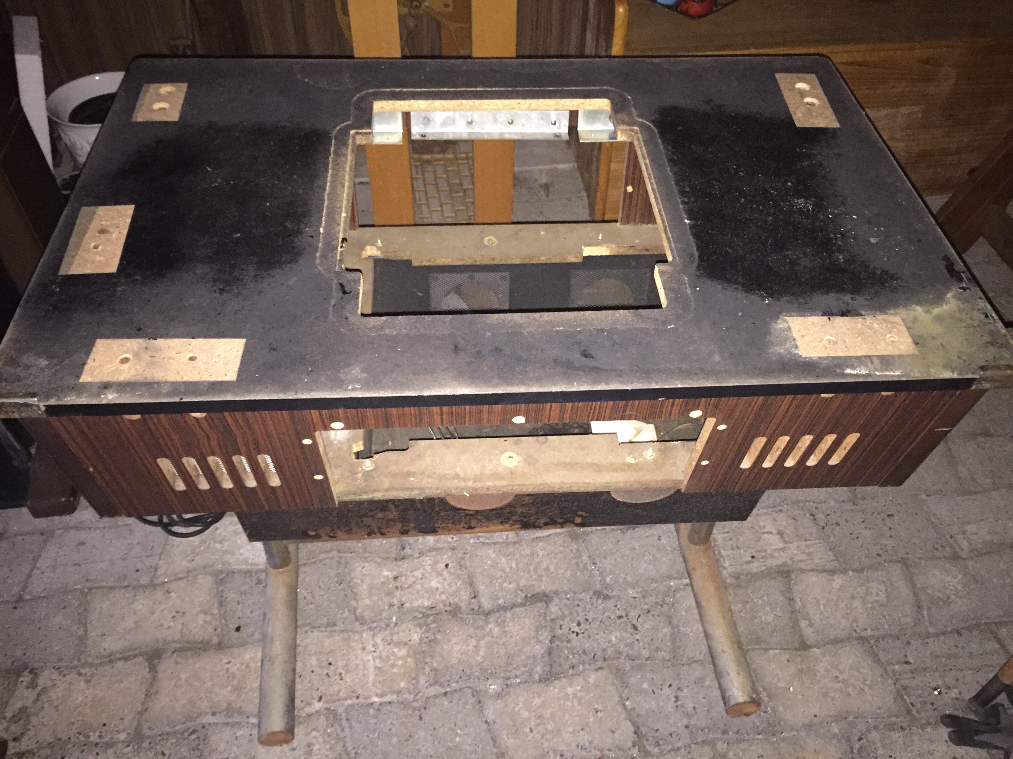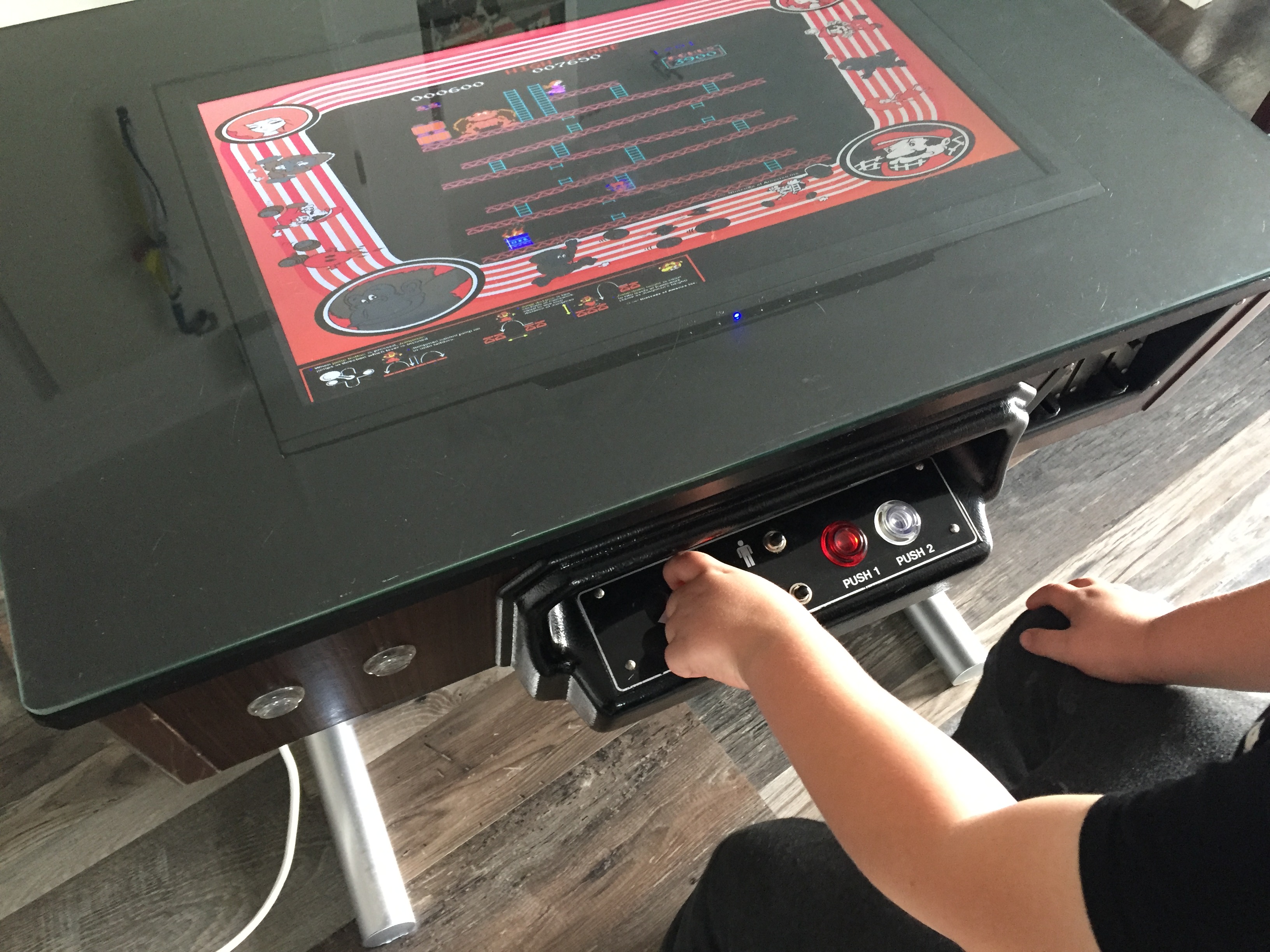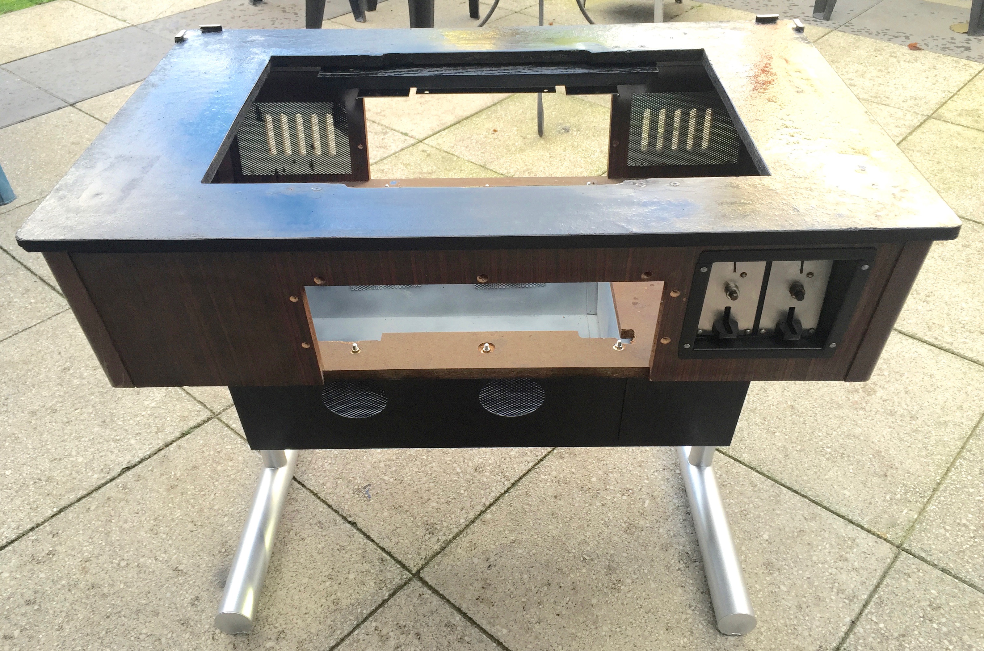 Es war eher ein Zufall, als ich mir vor einiger Zeit einen Arcade Table gekauft habe. Auf dem Gerät war das Spiel Donkey Kong. Leider war der Monitor defekt und das Gerät insgesamt in einem schlechten Zustand. Bei der Restauration war mir wichtig, dass der 80er Jahre Nussbaum-Look erhalten bleibt. Die Münzprüfer mussten unbedingt erhalten bleiben und sollten auch weiterhin DM annehmen. Die Joysticks und Knöpfe musste ich erneuern. Auch den Röhrenmonitor habe ich durch einen 24″ Monitor ersetzt. Im inneren werkelt nun der Arcade Emulator M.A.M.E.