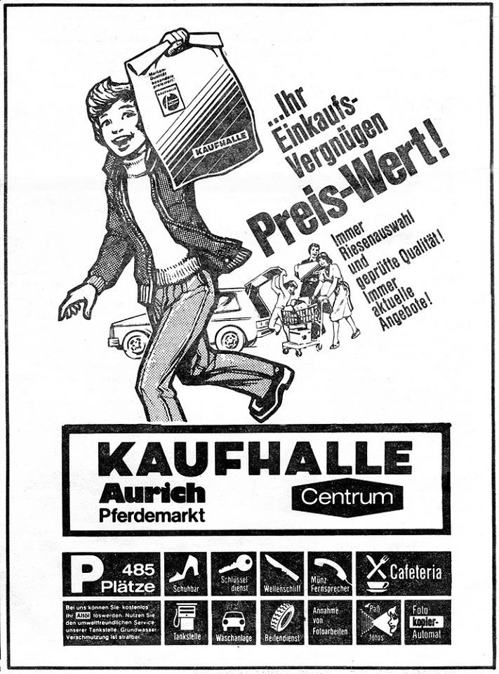 In der Kaufhalle Aurich konnte man von Bekleidung, Schmuck, Lebensmitteln, TV, Hifi und Werkzeug fast alles kaufen. Im Eingangsbereich der Kaufhalle stand lange Zeit ein Night Driver Automat.