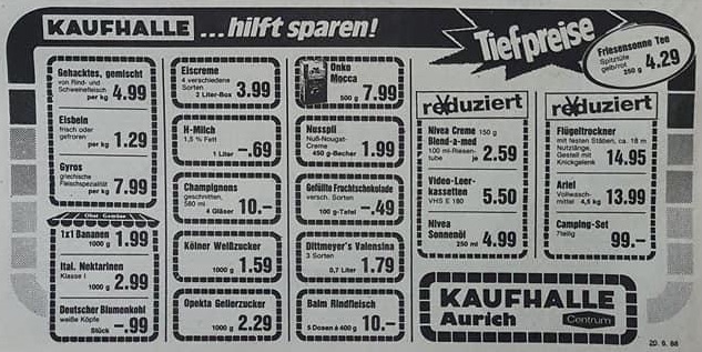 Einige der hier beworbenen Firmen aus den 80er Jahren gibt es in Aurich leider nicht mehr. Andere Firmen sind nur innerhalb der Stadt umgezogen. In meiner Kindheit waren sie jedoch alle noch da. Bei einigen Werbeanzeigen schwelge ich immer schnell in Erinnerungen. Vorallem das Geschäft mit Tonträgern ist heute in Aurich leider auf ein paar ganz wenige Händler zusammen geschrumpft. Geschäfte mit einem wirklichen breiten Sortiment suche ich heute vergebens. Wo gibt es noch Werkzeug, Kleidung und Spielzeug in einem Laden? Dennoch ist es wirklich eine wahre Freude zu sehen, daß es immer noch den „kleinen“ Einzelhändler in Aurich gibt!