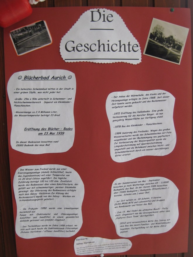 Das Blücher-Bad Aurich war ein reines Freibad. Im Freibad verbrachten wir die meiste Zeit unserer Sommerferien. Am Kiosk gab es alles um uns die Zeit zu versüssen. Im Blücherbad habe ich mein Seepferdchen gemacht. Leider gibt es das Blücherbad heute nicht mehr.