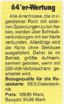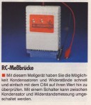 Die RC-Messbrücke 9549 von Rex Datentechnik dient zum Messen von Elkos, Kondensatoren, Widerständen un Potis. Die Messwerte können auf Diskette gespeichert werden. Katalogpreis Rex 79,- DM.