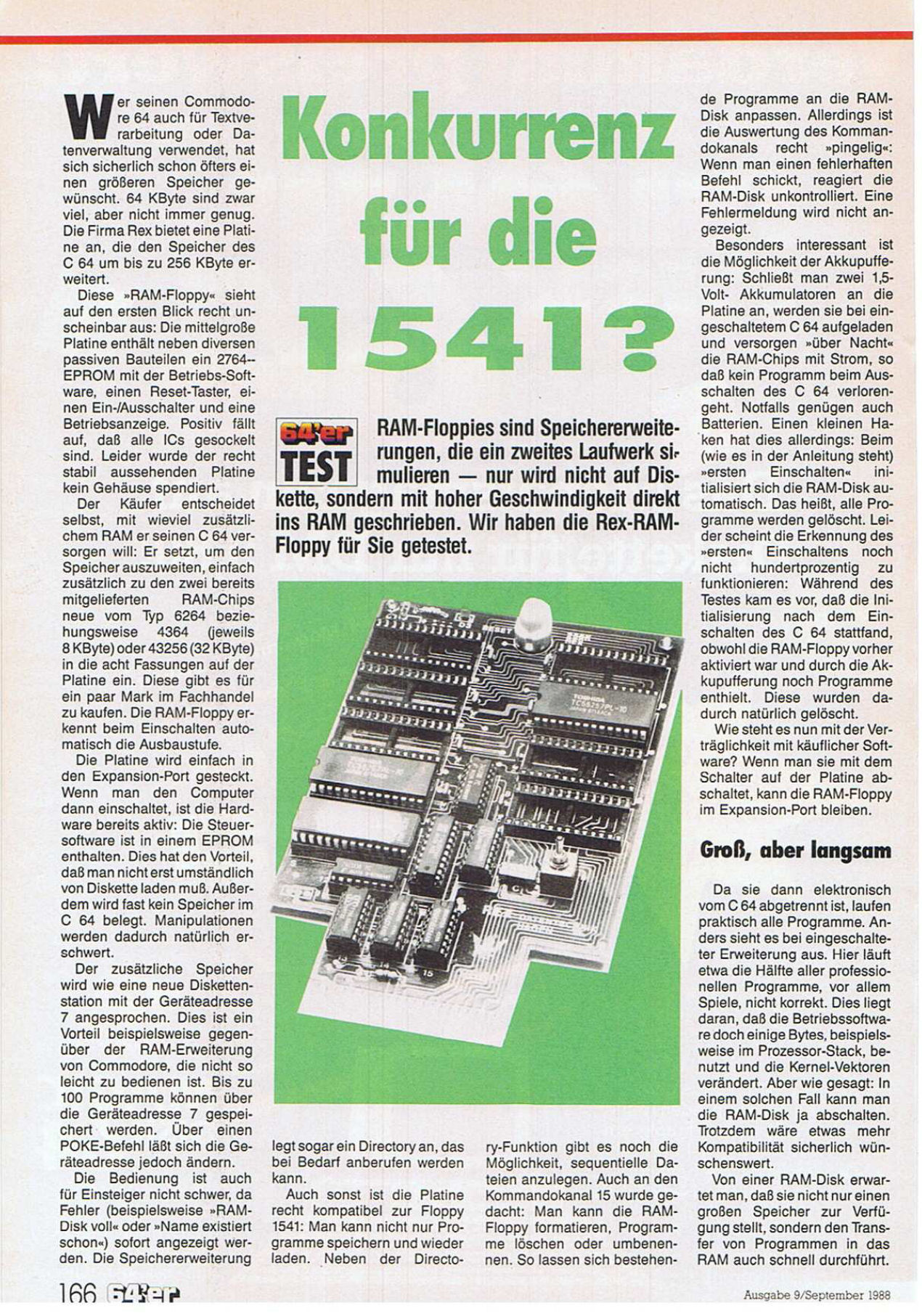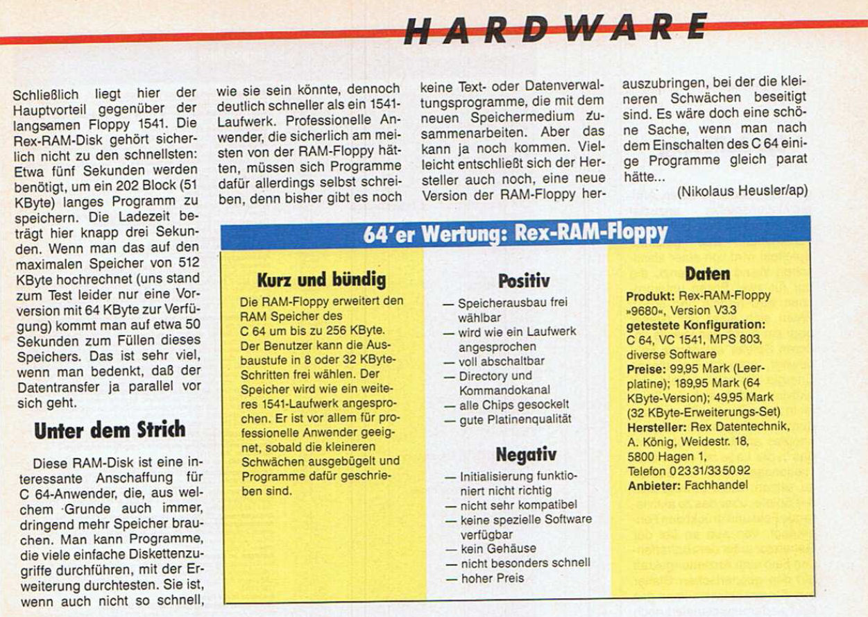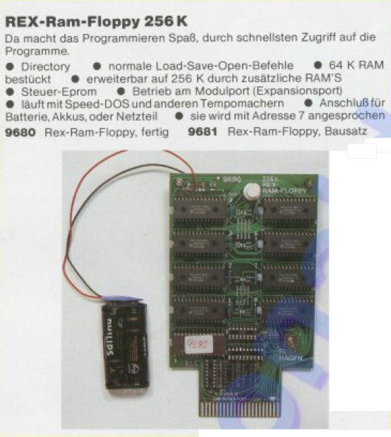 Die RAM Floppy Rex 9680 kann mit 256K Ramriegeln bestückt werden. Gespeist wird die Steckkarte über eine 9V Batterie. Die Karte wird mit der Geräte-ID 7 angesprochen. Die Karte kann deaktiviert werden und besitzt einen Resettaster. Katalogpreis Rex 159,- DM.