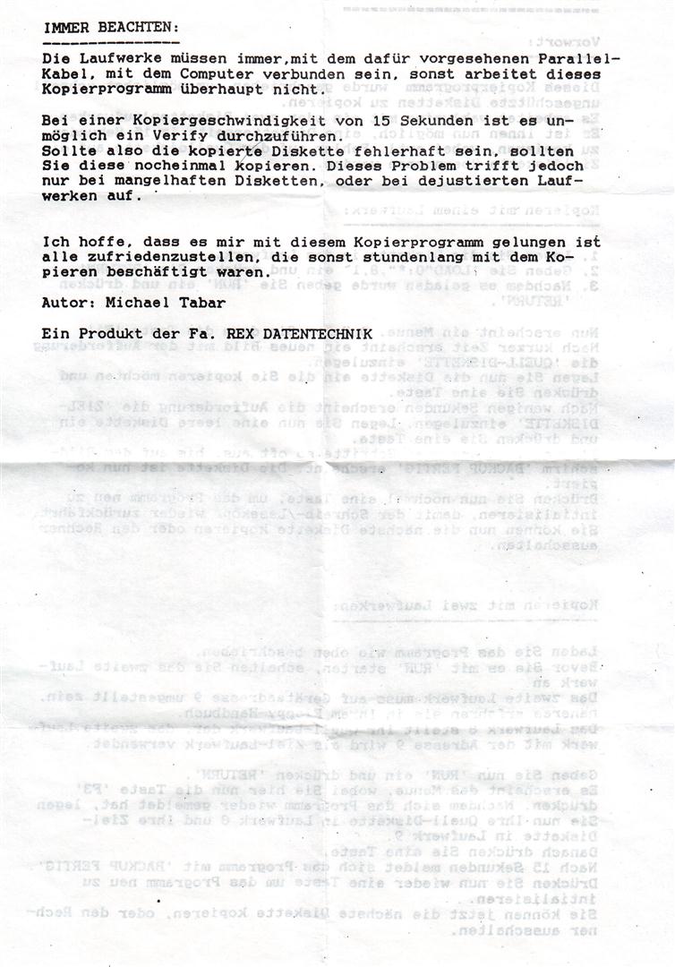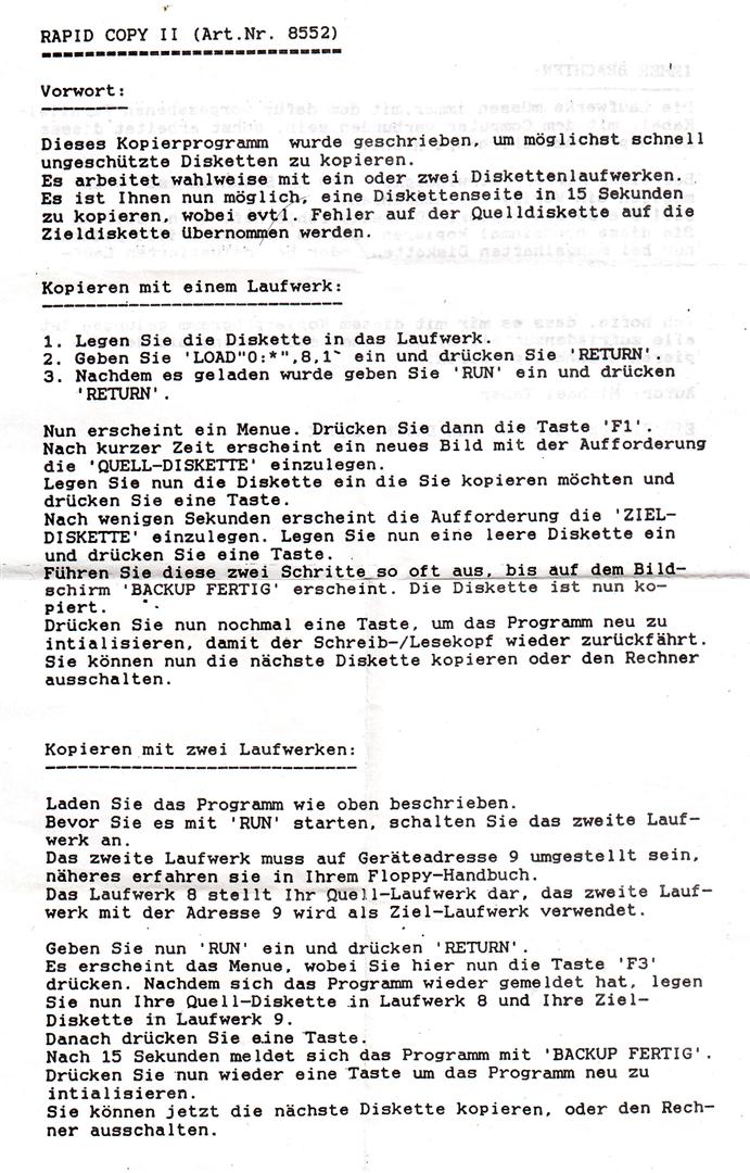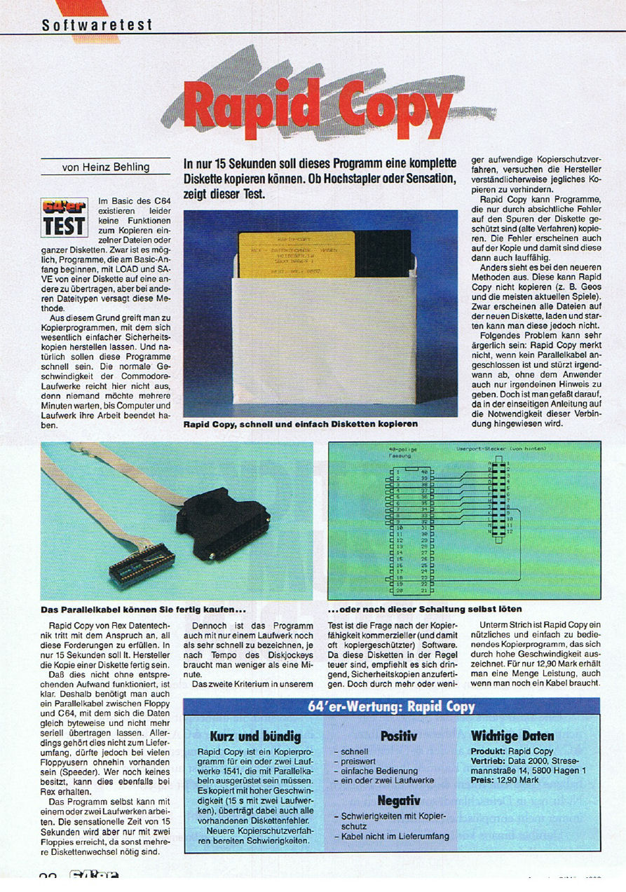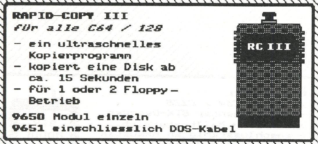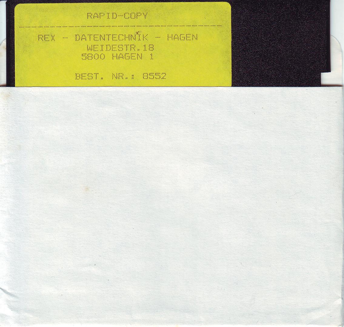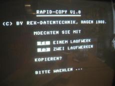 Rapid Copy 9650 V 1.0 ist ein Kopierprogramm von Rex Datentechnik. Das Programm kopiert Disketten sehr schnell mit einem oder mit zwei Laufwerken ab ca. 15 Sekunden. Das Modul ist abschaltbar und hat einen Resettaster.