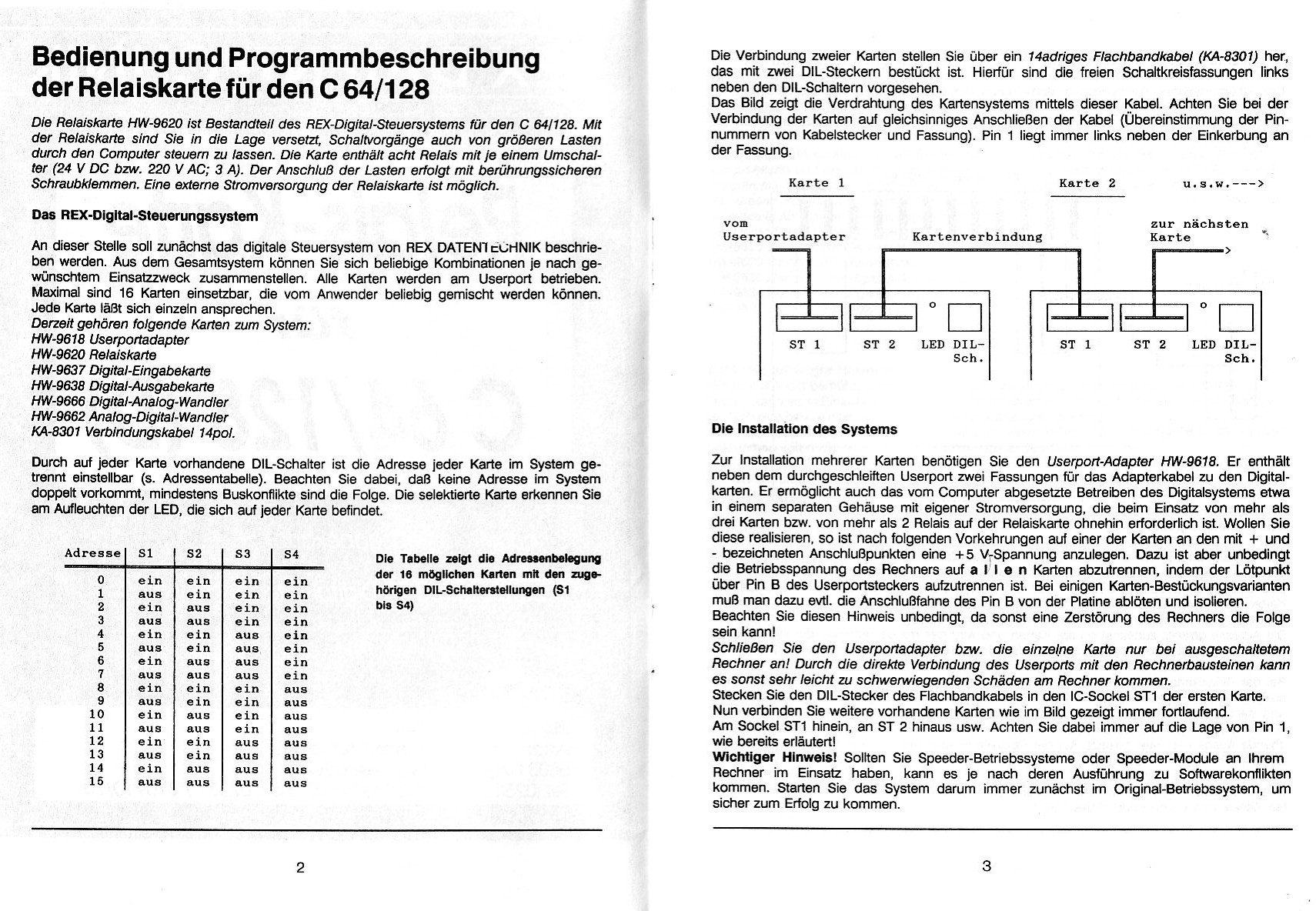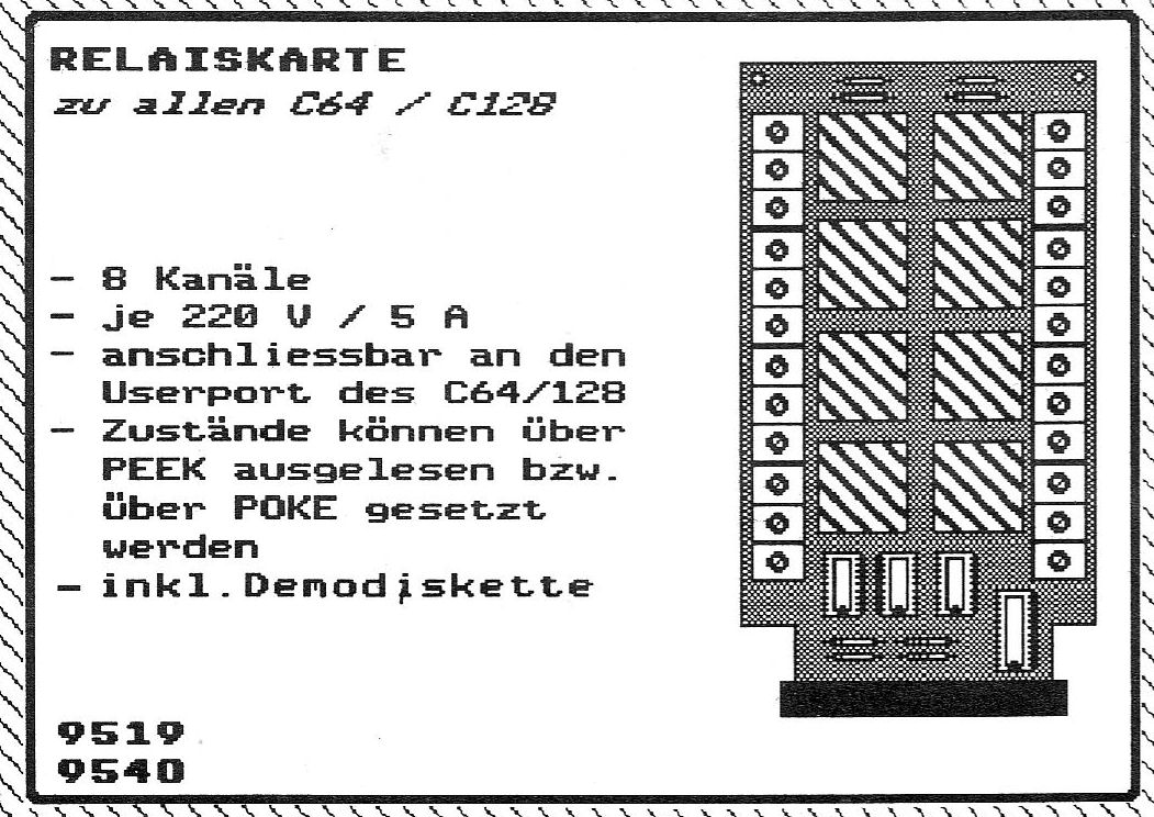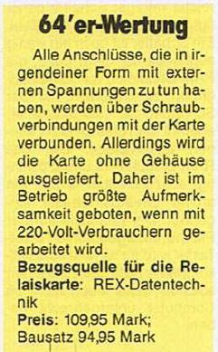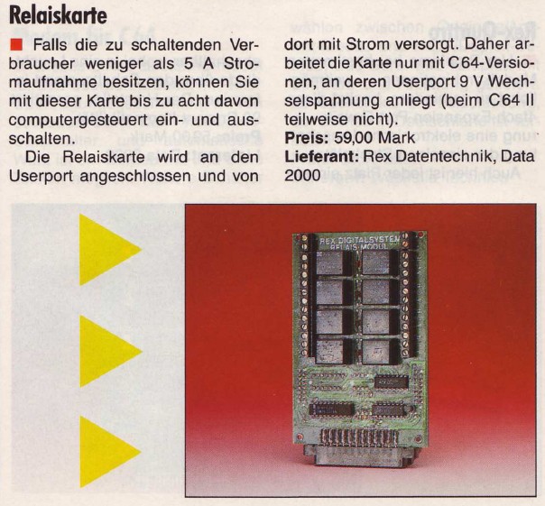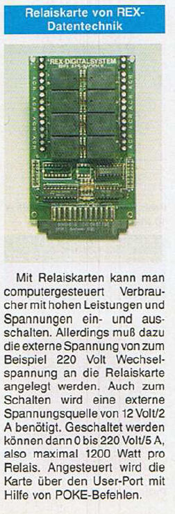 Mit dem Relais Modul 9519 von Rex Datentechnik lassen sich Schaltungen mit 24V DC bzw. 220V AC mit 3A realisieren. Mit dem Userportadapter 9618 lassen sich mehrere Karten miteinander verbinden. Der Verkaufspreis lag bei 99,95 DM.