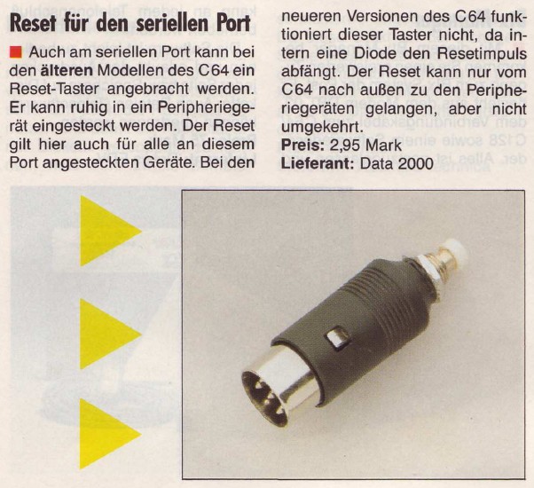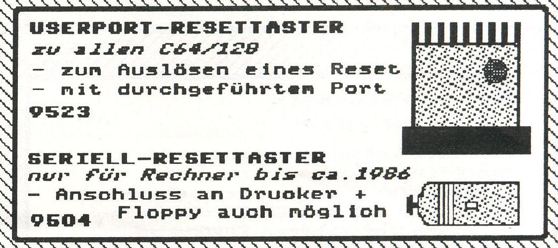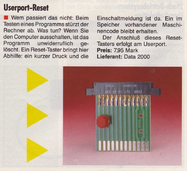 Der Resettaster 9523 von Rex Datentechnik hat einen durchgeführten Userport. Verkaufspreis Rex Datentechnik Katalog 11,70 DM.