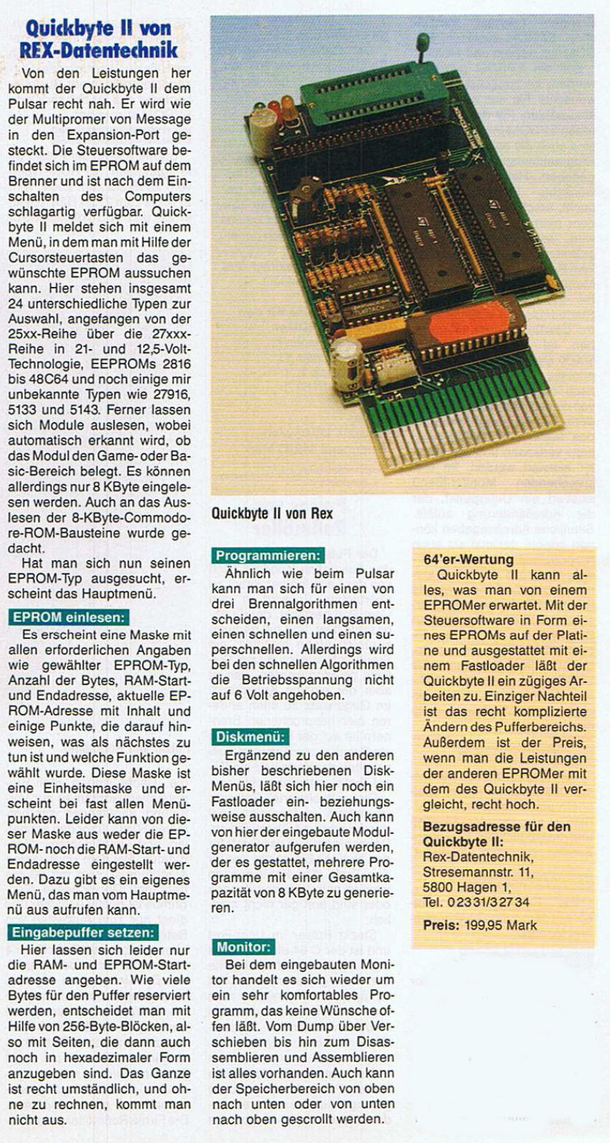 Der Quickbyte Eprommer 2 9603 von Rex Datentechnik brennt alle 25xx, 2716-27512, kompatible CMOS-Typen sowie EEPROMS (x12016a/x12864). Die Software des Quickbyte II meldet sich direkt nach dem Einschalten. Katalogpreis Rex 198,- DM.