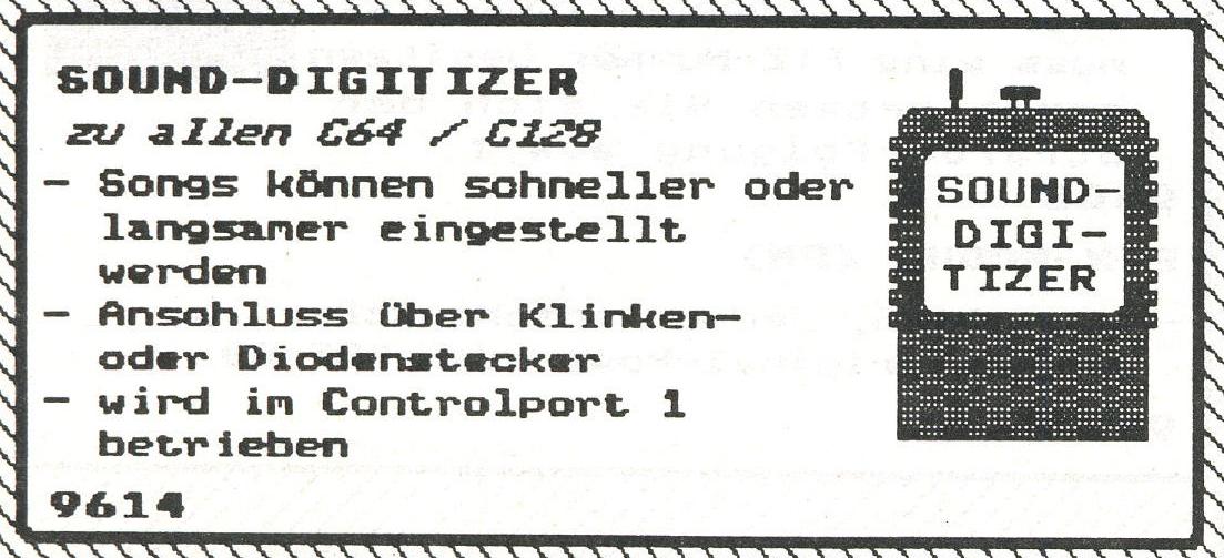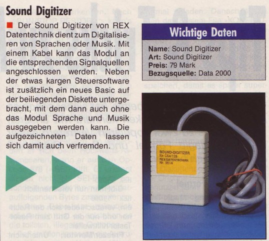 Der Sound Digitizer 9614 von Rex Datentechnik wird an den Joystickport 1 angeschlossen. Mit dem 2-Bit Digitizer können Songs und Samples schneller oder langsamer eingestellt werden.