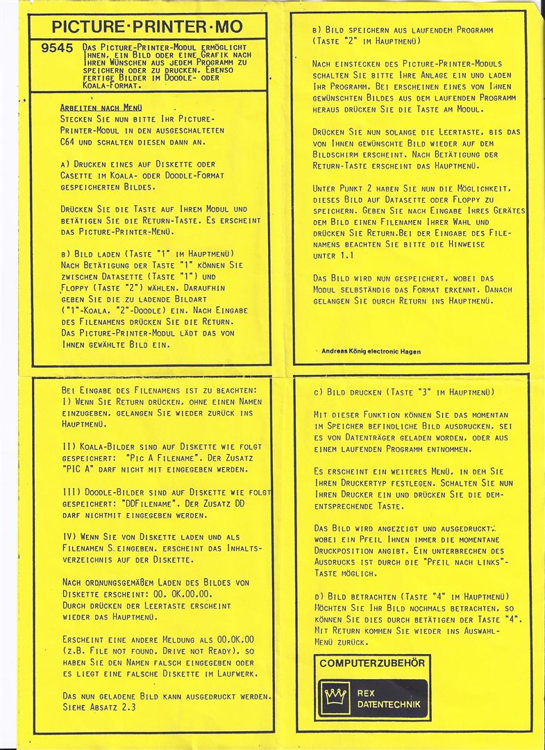 Das Pictures Printer Modul 9545 von Rex Datentechnik dient zum Ausdruck beliebiger Grafiken und Texten in 16 Grautönen oder Farben. Diese Funktion wird einfach per Tastendruck aktiviert. Das Modul läßt sich über einen Schalter deaktivieren. Katalogpreis Rex Datentechnik 99,- DM.