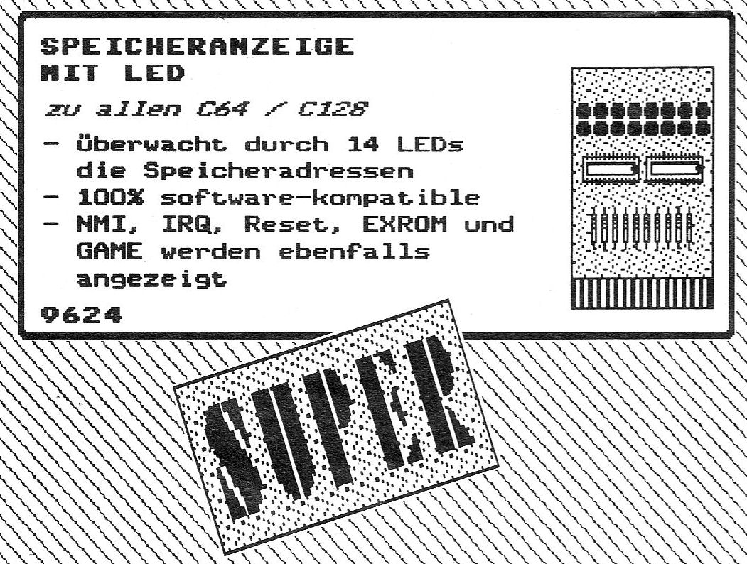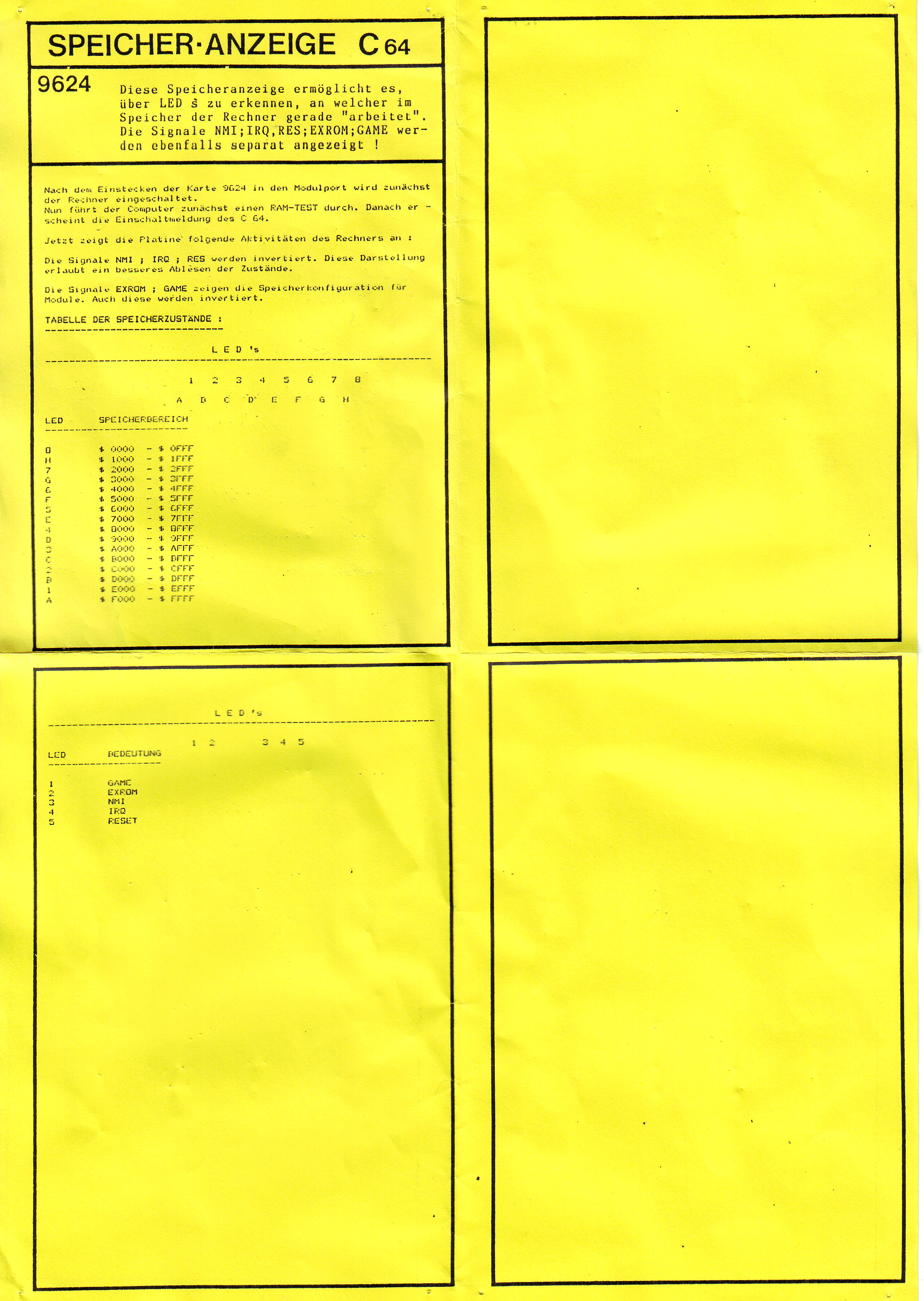 Die Speicheranzeige 9624 von Rex Datentechnik zeigt über LED’s an, an welcher Speicheradresse der C64/C128 gerade arbeitet. Die Signale NMI, IRQ, RES, EXROM und GAME werden ebenfalls von der Speicher-Anzeige separat angezeigt.
