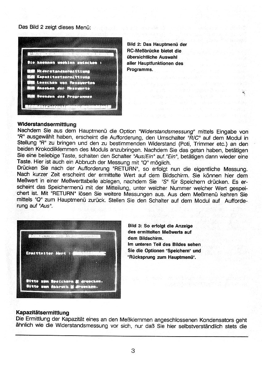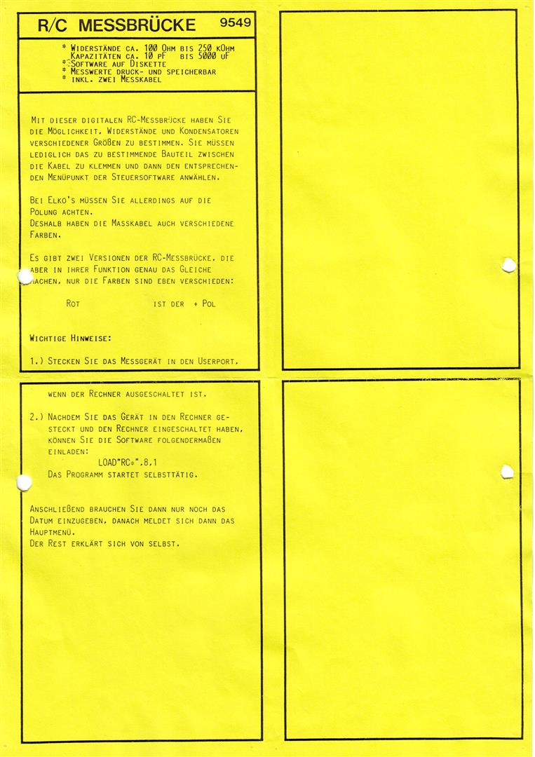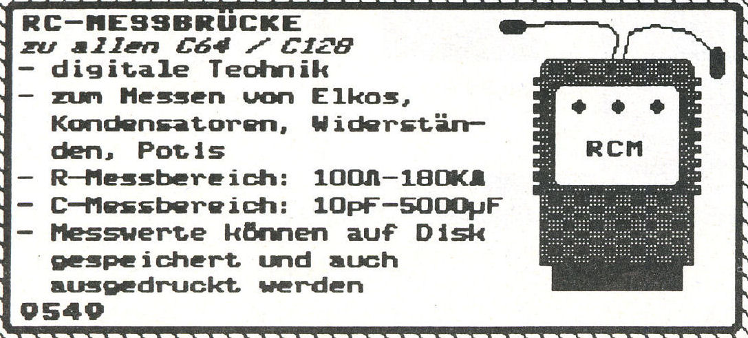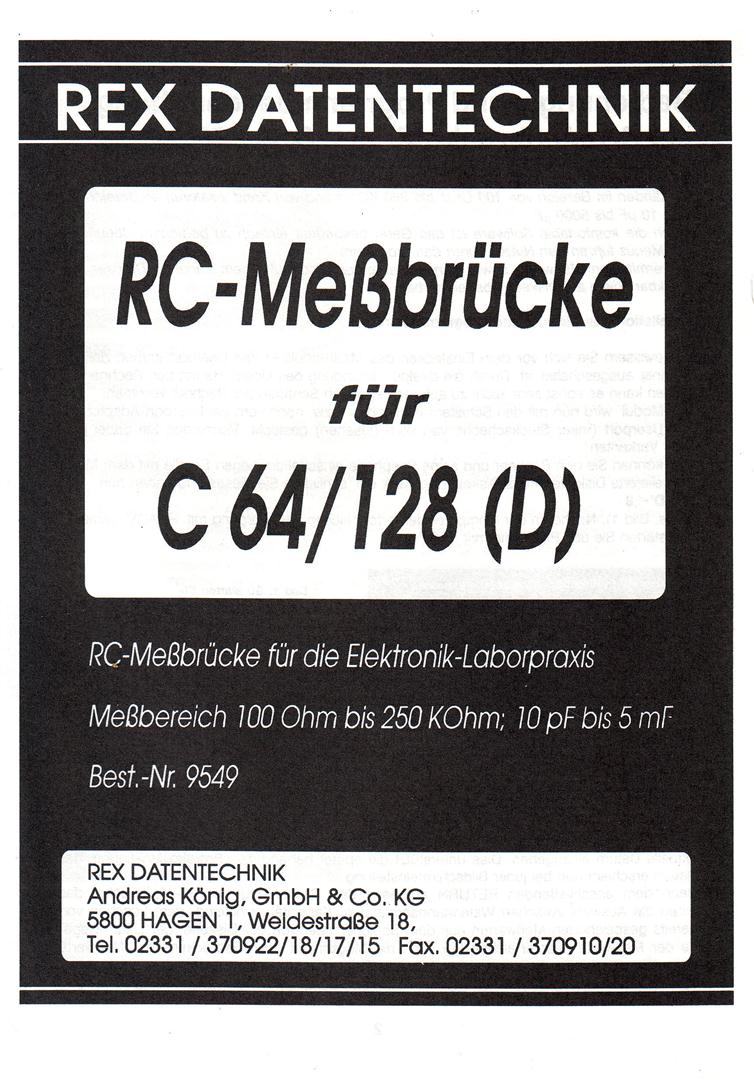 Die RC-Messbrücke 9549 von Rex Datentechnik dient zum Messen von Elkos, Kondensatoren, Widerständen un Potis. Die Messwerte können auf Diskette gespeichert werden. Katalogpreis Rex 79,- DM.