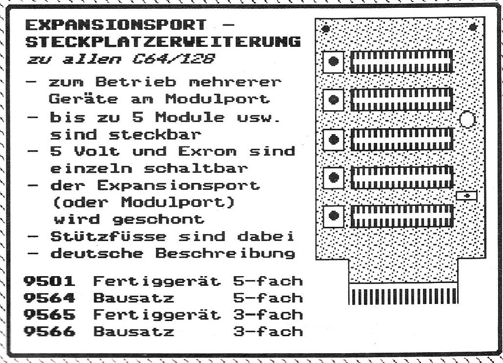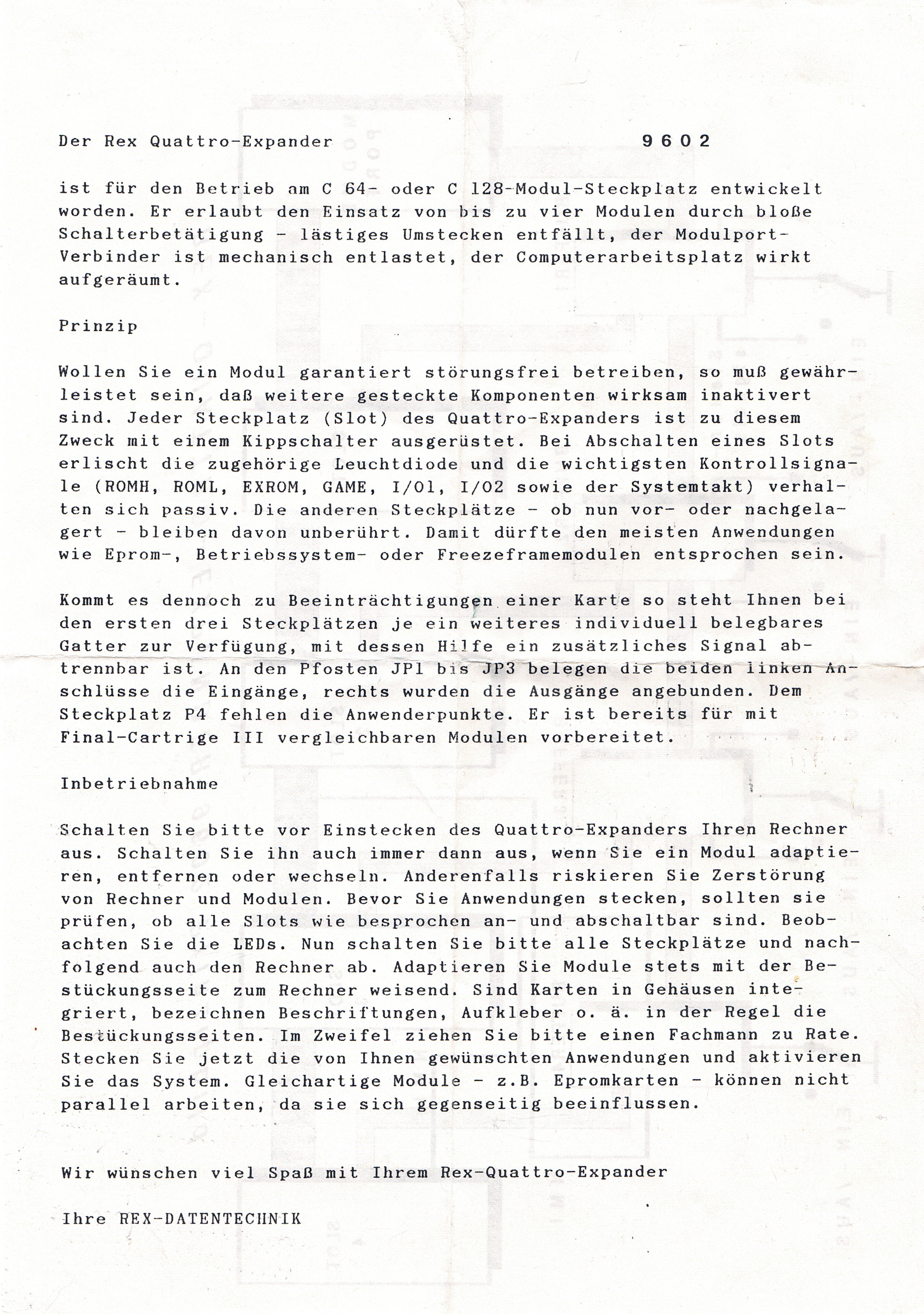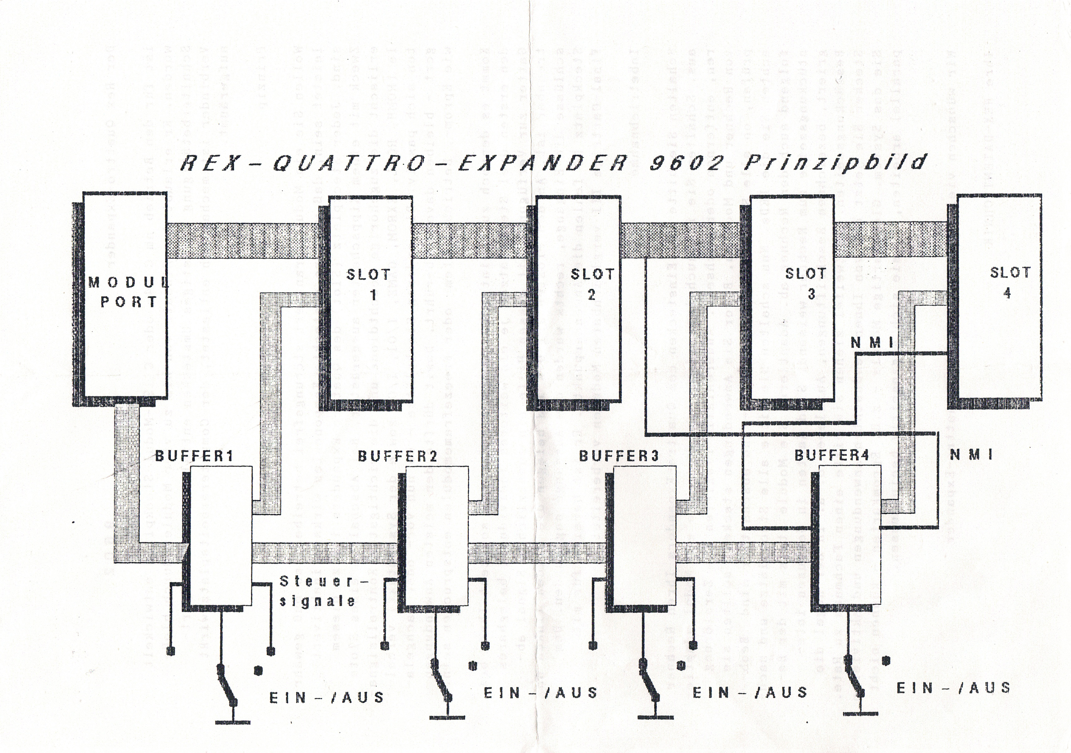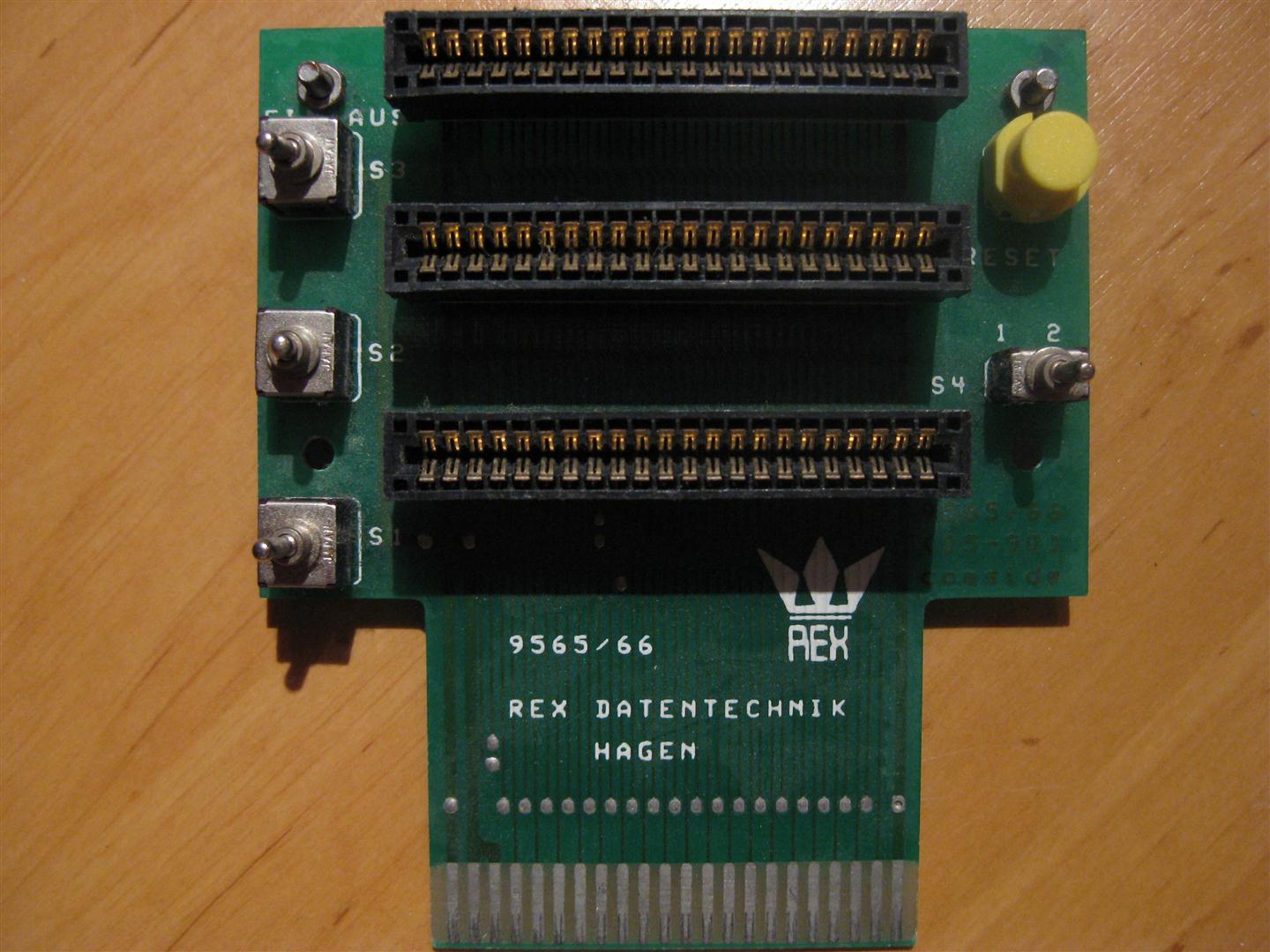 Die Steckplatz-Erweiterung 9565/9566 von Rex Datentechnik bietet Platz für insgesamt drei Module, die unabhängig voneinander durch Kippschalter aktiviert werden können. Außerdem befindet sich auf der Karte ein zusätzlicher Schalter, der es ermöglicht Betriebssysteme im Speicherbereich von $e000 bis $ffff einzublenden. Weiterhin besitzt die Karte einen Resettaster. Katalogpreis Rex 85,- DM.